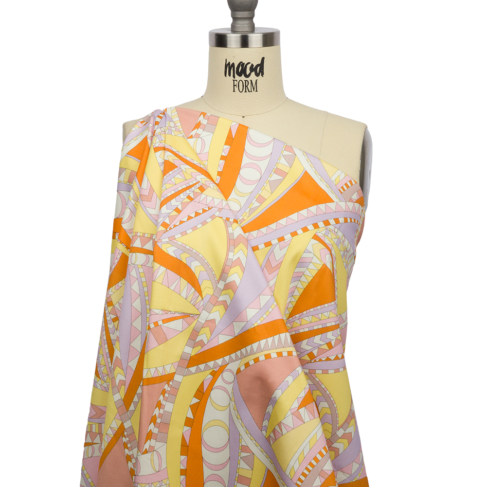Jump into the world of this Mood Exclusive Pink Lizard Leap Stretch Cotton Sateen. Pink, orange and yellow gravitate toward geometry as they spin, spiral, and cut across this bold material. Flexible in drape, cotton sateen is prized for its breathable nature. Part of The Groove Collection, this particular variety is smooth and soft in hand, with a subtle sheen and 10% stretch through the weft. The sewing possibilities are endless; try trousers, dresses, jackets, or structured tops. Swing by our Mood Sewciety Blog to take a glance at over 300 free sewing patterns for more inspiration. For cotton sateen, we recommend the Taro Jumper, Liv Pants, and Avelia Bomber.MoodEarth Verified: BCI, or Better Cotton Initiative, focuses on the exchange of good practices, including economic, environmental, and social concerns, in the production of cotton. For more information on Mood's sustainability initiatives, check out MoodEarth here.