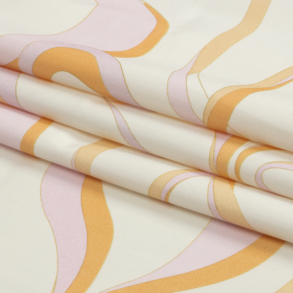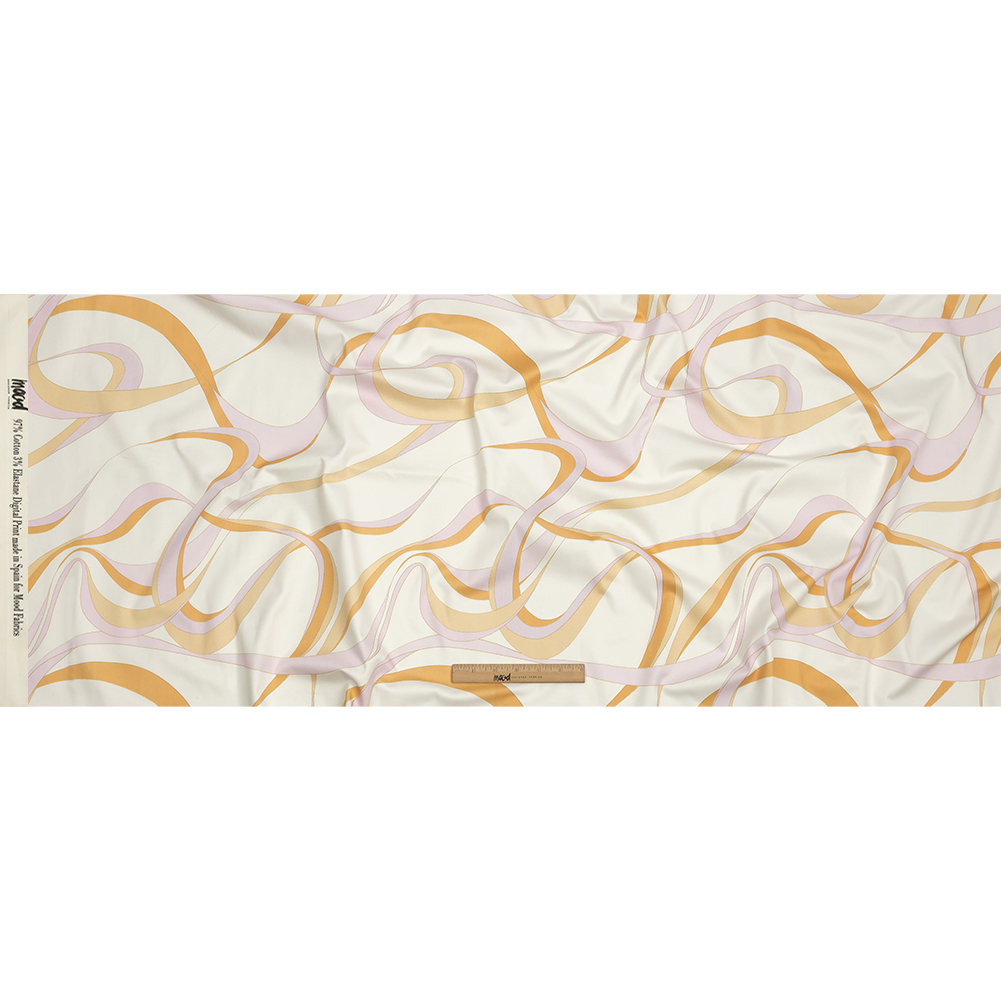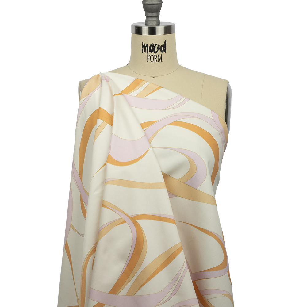Go with the flow of this Mood Exclusive White Free Spirit Stretch Cotton Sateen. Pastel golden yellow, lilac, and mango orange ribbons stream across a whisper white ground, like they're blowing in the wind or wrapping around a dancer. Flexible in drape, cotton sateen is prized for its breathable nature. Part of The Groove Collection, this particular variety is smooth and soft in hand, with a subtle sheen and 10% stretch through the weft. The sewing possibilities are endless; try trousers, dresses, jackets, or structured tops. Swing by our Mood Sewciety Blog to take a glance at over 300 free sewing patterns for more inspiration. For cotton sateen, we recommend the Taro Jumper, Liv Pants, and Avelia Bomber.MoodEarth Verified: BCI, or Better Cotton Initiative, focuses on the exchange of good practices, including economic, environmental, and social concerns, in the production of cotton. For more information on Mood's sustainability initiatives, check out MoodEarth here.