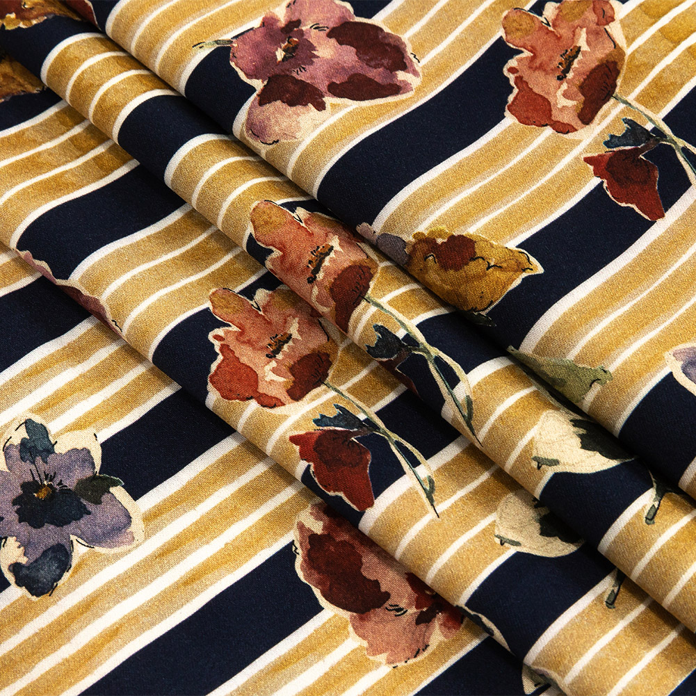 Stretch Cotton Sateen - Yellow and Navy Floral over Stripes - Harmonious Hibiscus Print - Mood Exclusive Tumunyana Collection