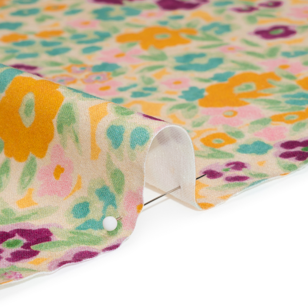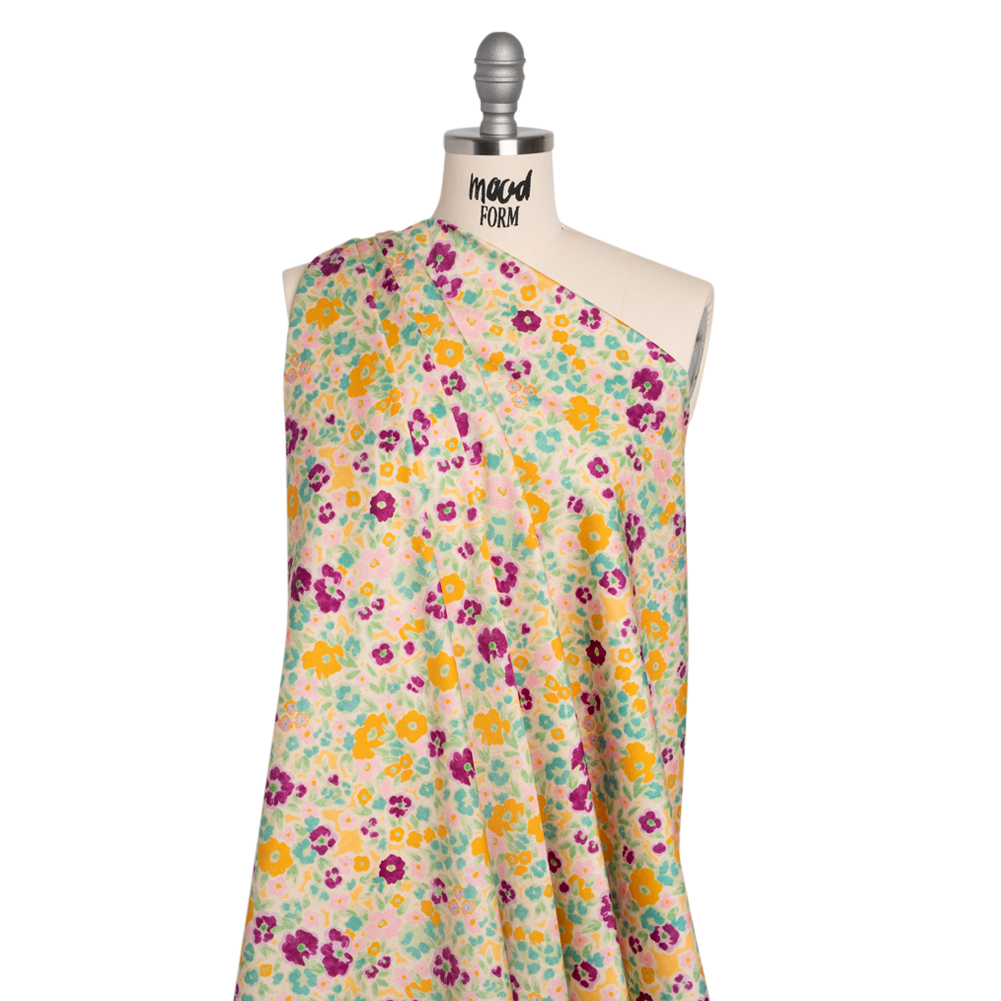 Escape to the countryside in this Midsummer Meadow Stretch Cotton Sateen, featuring a slight weftwise stretch, malleable drape, and cool hand thanks to its stretch cotton content—perfect for stunning summer styles.Suggested Projects: Pants, Dresses, Tops, JacketsContent: 97% Cotton 3% ElastaneStretch: 10% WeftwiseOpacity: OpaqueTumble into a meadow of marigold yellow, Robin’s egg blue, magenta, and blush pink florals! This sateen recalls carefree summers spent outside; no worries, just a breeze blowing through the air and sunbeams tickling your face. Malleable and slightly crisp in drape, cotton sateen is prized for its breathable nature. Part of The Chariot Collection, this particular variety is cool and crisp in hand with a 10% stretch through the weft. In saturated shades, the sewing possibilities are endless; try fit-and-flare trousers, brilliant blazers, and shift dresses.