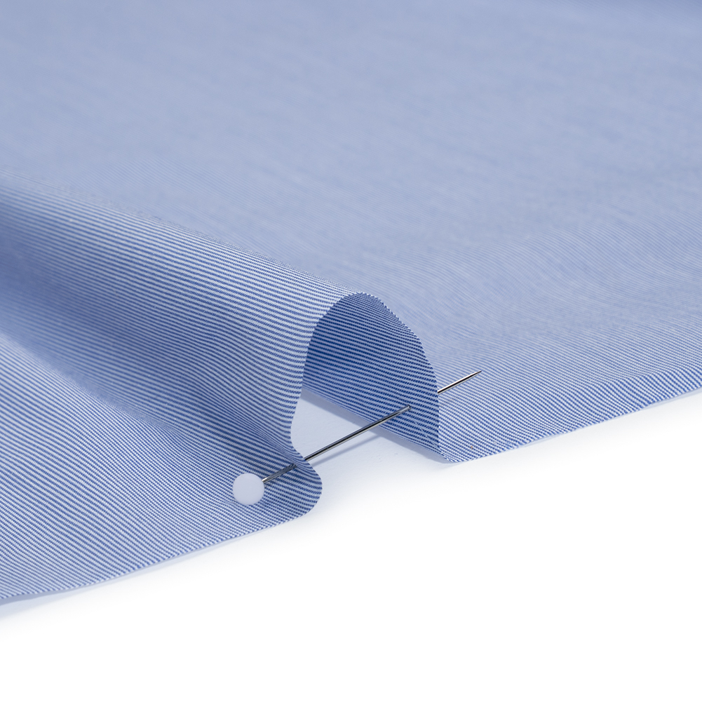 Stretch the versatility of your shirting with this Bold Blue and White Micro Stripes Stretch Cotton Shirting—featuring a cool, crisp hand and flexible drape.Suggested Projects: Shirts, Shorts, Skirts, DressesContent: 78% Cotton, 17% Nylon, 5% ElastaneStretch: 20% WeftwiseOpacity: Slightly TranslucentBold blue and white threads intersect in crisp micro-stripes, giving this stretch cotton shirting a sharp look with timeless appeal. Cool and crisp to the touch, this cotton shirting offers a flexible drape and a touch of stretch through the weft—perfect for warm-weather wear that moves with ease. Lightweight, breathable, and effortlessly airy, it channels the carefree spirit of sunny afternoons. Ideal for chic fit-and-flare dresses, playful sailor shorts, relaxed button-ups, and sleek mini skirts. Slightly translucent, a lining may be added for extra coverage and structure.