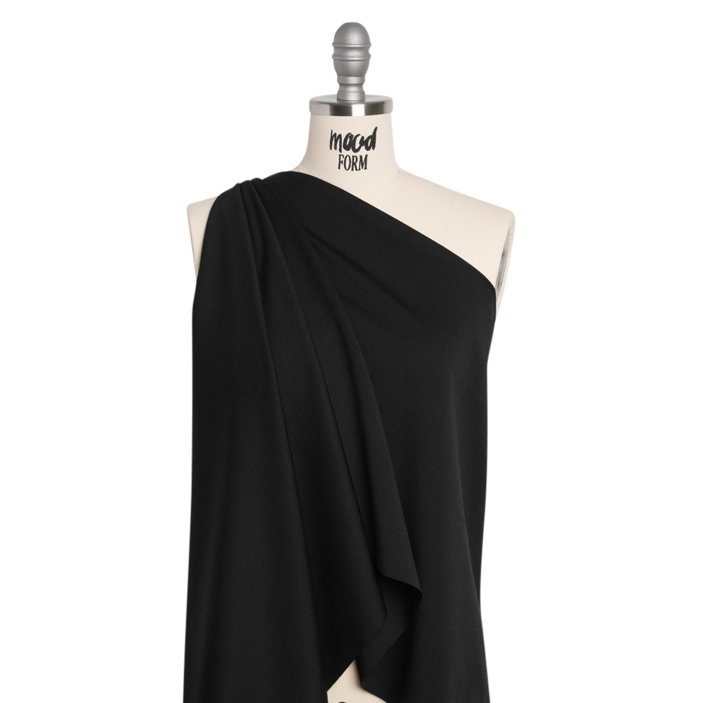 Clean up nicely with this Black Stretch Creped Wool Suiting, featuring a tactile hand and fluid drape—perfect for unique wardrobe staples.Suggested Projects: Shirts, Pants, Dresses, SkirtsContent: 98% Wool, 2% ElastaneStretch: 10% WeftwiseOpacity: Slightly TranslucentWith the tell-tale tactile texture of crepe, this black wool suiting is a great choice to subtly spice up your wardrobe. With a slight stretch through the weft and subtle sheen, allow the fluid drape of this fabric to create jaunty three-piece suits, simple yet elegant H-line dresses, and more! Slightly translucent, we suggest pairing this fabric with a lining for complete opacity and added structure.