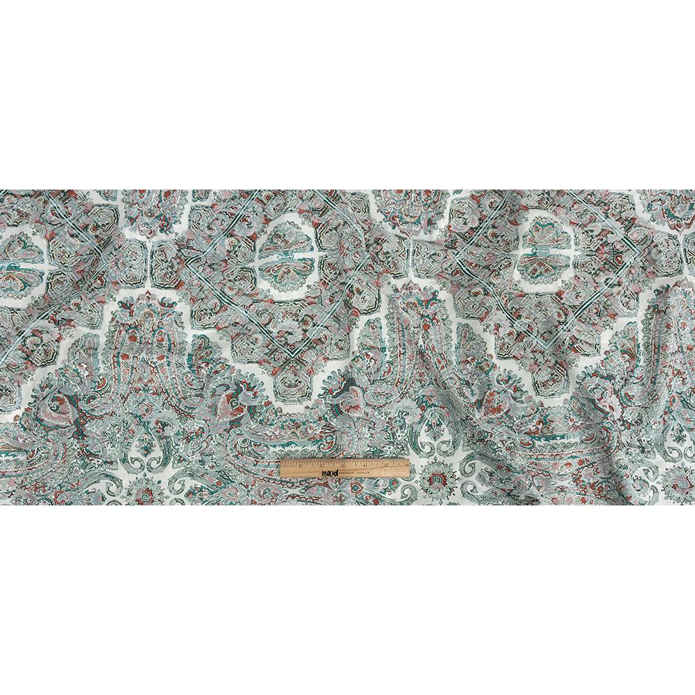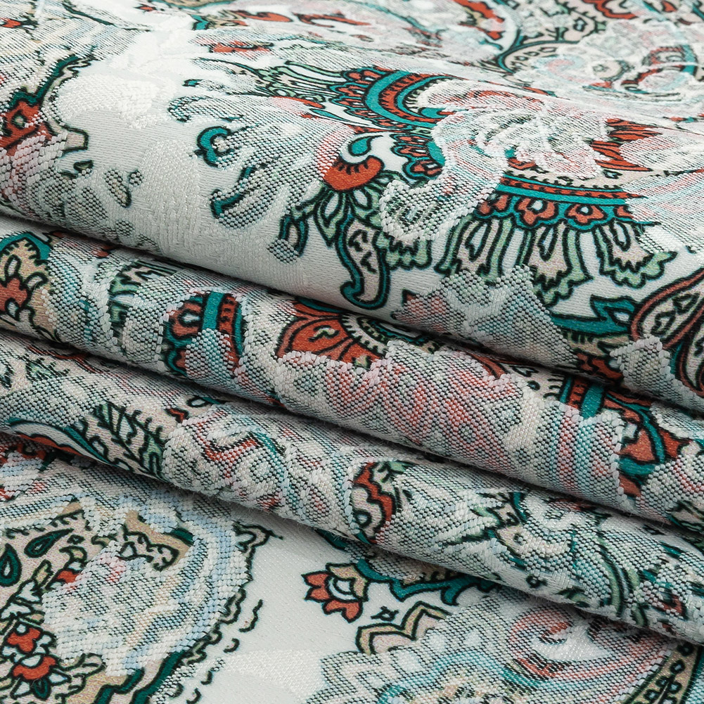 Unlock your style potential with our Mood Exclusive Jade Interlocking Configurations Printed Stretch Floral Jacquard! Characterized by its ornately detailed design, this sophisticated jacquard boasts an intricate floral patterning paired perfectly with elaborate geometric motifs and shapes in jeweled hues of elegant jade, deep turquoise blue, soft mint green, light beige, bright tangerine orange, and scattered accents of vibrant peach that breathe life into the luscious white ground.