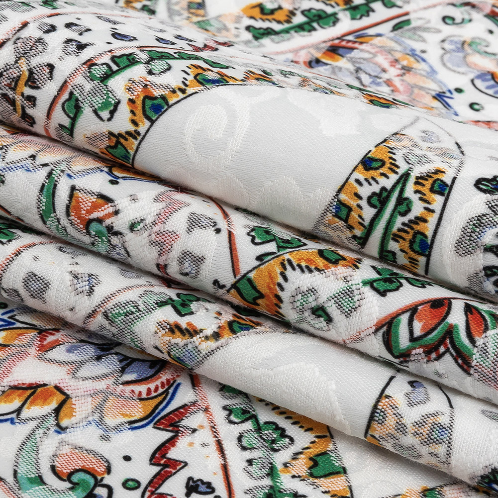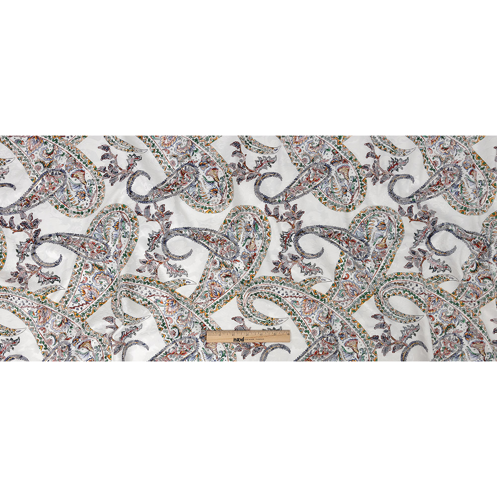 Paisleys have never radiated such sophistication and luxury! Our Mood Exclusive Orange Stratagem Sophistication Printed Stretch Floral Jacquard features elegantly prominent paisleys and floral accents in tangerine orange, emerald green, scarlet red, cobalt blue, and lilac purple that twist and turn in a spectacular dance across a stunningly white stage.