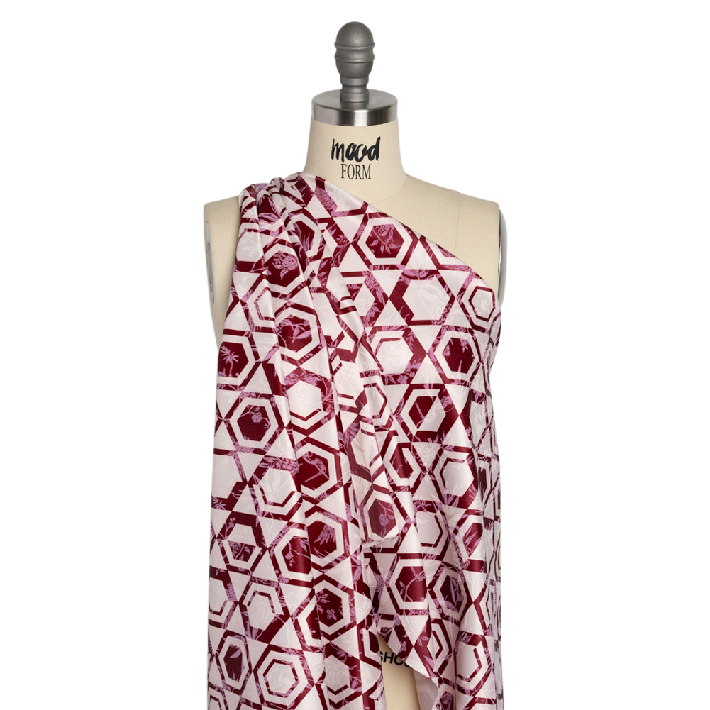 Take your wardrobe to the next level with this Mood Exclusive Cherry Hive Printed Stretch Flowers and Cranes Jacquard. Light magenta flowers, leaves, and cranes rise from a pink and maroon hexagons in an embroidered-like texture—a captivating characteristic of a Jacquard. The traditional imagery paired with a retro-inspired pattern will create eye-catching formalwear that transcends trends and styles.Along with its sleek hand and lustrous face, a 25% weft-wise stretch promotes comfortable movement, making this fabric truly a jacq of all trades! Medium-weight and malleable, this fabric rests cool on the skin as a button-up, shift dress, and pants-suit, or use it to line blazers and jackets! Mostly opaque, a lining may be desired for added structure. Please note: the repeat measurement listed is for the printed pattern; the repeat of woven pattern is 8" vertically and 5.75" horizontally.