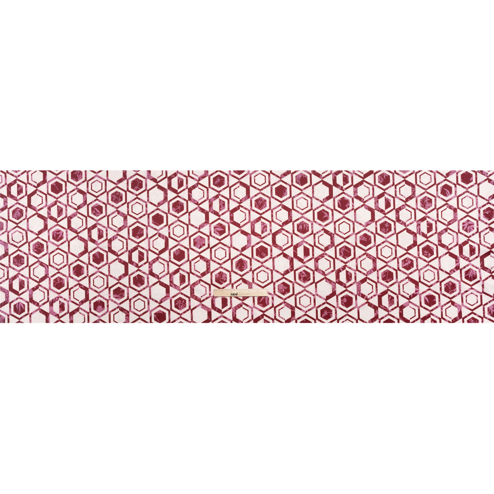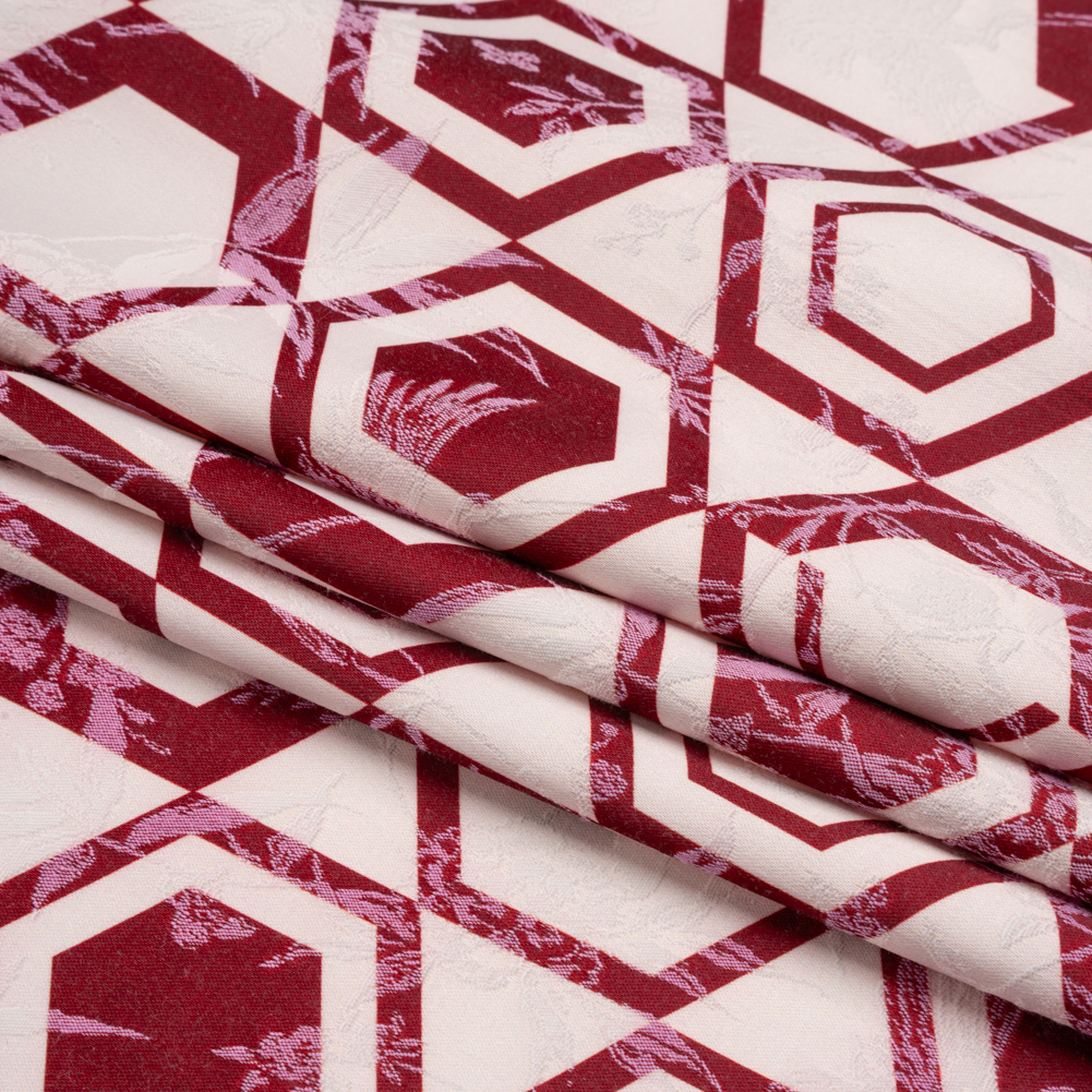 Stretch Flowers and Cranes Jacquard Print - Berry Red and White Hexagons - Mood Exclusive Cherry Hive