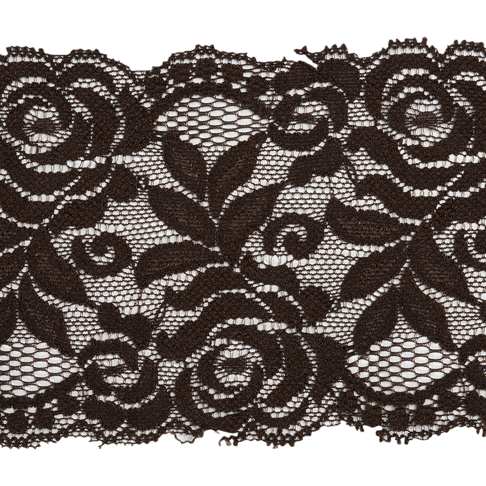 Stretch Lace Trim – 3.25″ – Chocolate Brown Roses and Leaves with Scalloped Edges