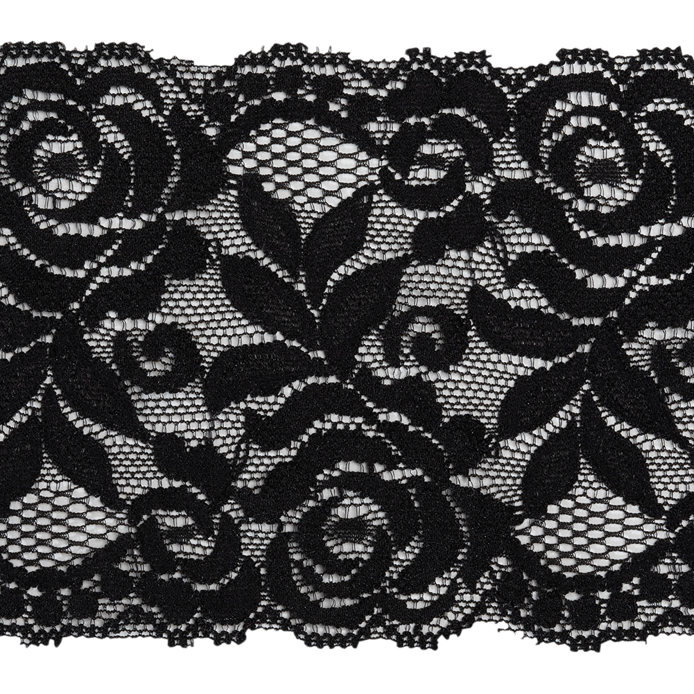 You don’t need to go to the black market to find this Black Roses and Leaves Stretch Lace Trim—featuring a slight stretch through the length, tactile hand, and flexible drape.Width: 3.75"Content: Polyester, ElastaneStretch: 25% LengthwiseBlack roses and leaves bloom across this thick lace trim, finished with scalloped edges. With a 25% stretch and a rich black coloring throughout, this trim’s appeal is absolutely undeniable. At 3½ inches wide, creating decorative hems on bralettes, crop tops, and vintage-inspired gowns has never been easier!