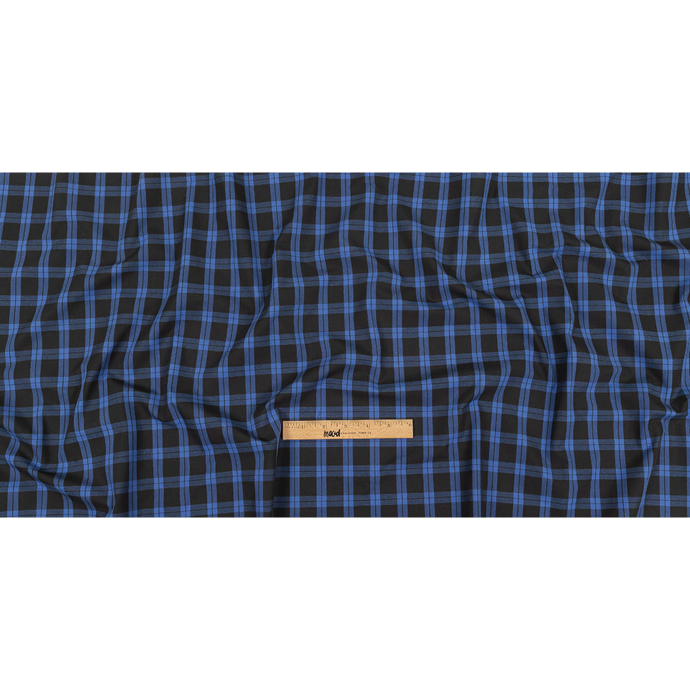 You may think you've seen this Stretch Limo and Deja Vu Blue Plaid Cotton Shirting before, but we promise you haven't! Pairs of blue lines criss-cross a black ground, creating a simple plaid pattern on a crisp cotton shirting. Cool in hand with a malleable drape and no stretch, create easy button-downs, boxy blouses, and gathered skirts. Opaque, a lining is not necessary for most projects.