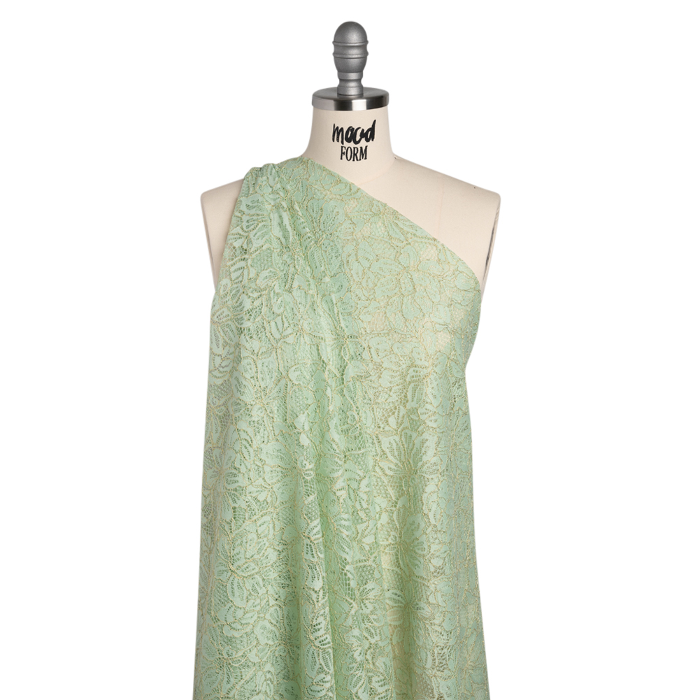 Piece together your pastel daydreams with this Dusty Aqua and Gold Tropical Blossoms Stretch Metallic Corded Lace with Finished Edges—featuring a tactile hand and fluid, flexible drape.Suggested Projects: Blouses, Skirts, Dresses, LingerieContent: 89% Nylon, 6% Lurex, 5% SpandexStretch: 25% WarpwiseOpacity: SheerIn a dusty aqua hue, tropical flowers bloom across this corded lace panel, complete with finished edges. This particular fabric has a tactile hand—thanks to the thin metallic gold cords running over the design—and features a fluid and flexible drape. With a slight stretch through the warp, this lace lends itself wonderfully to bodycon and loose, flowing silhouettes alike. Use it to create elegant gowns with long trains, mock-collar blouses, flowing skirts, or some lavish lingerie. Due to the nature of lace, some portions of this fabric are open so a lining may be desired for opacity.