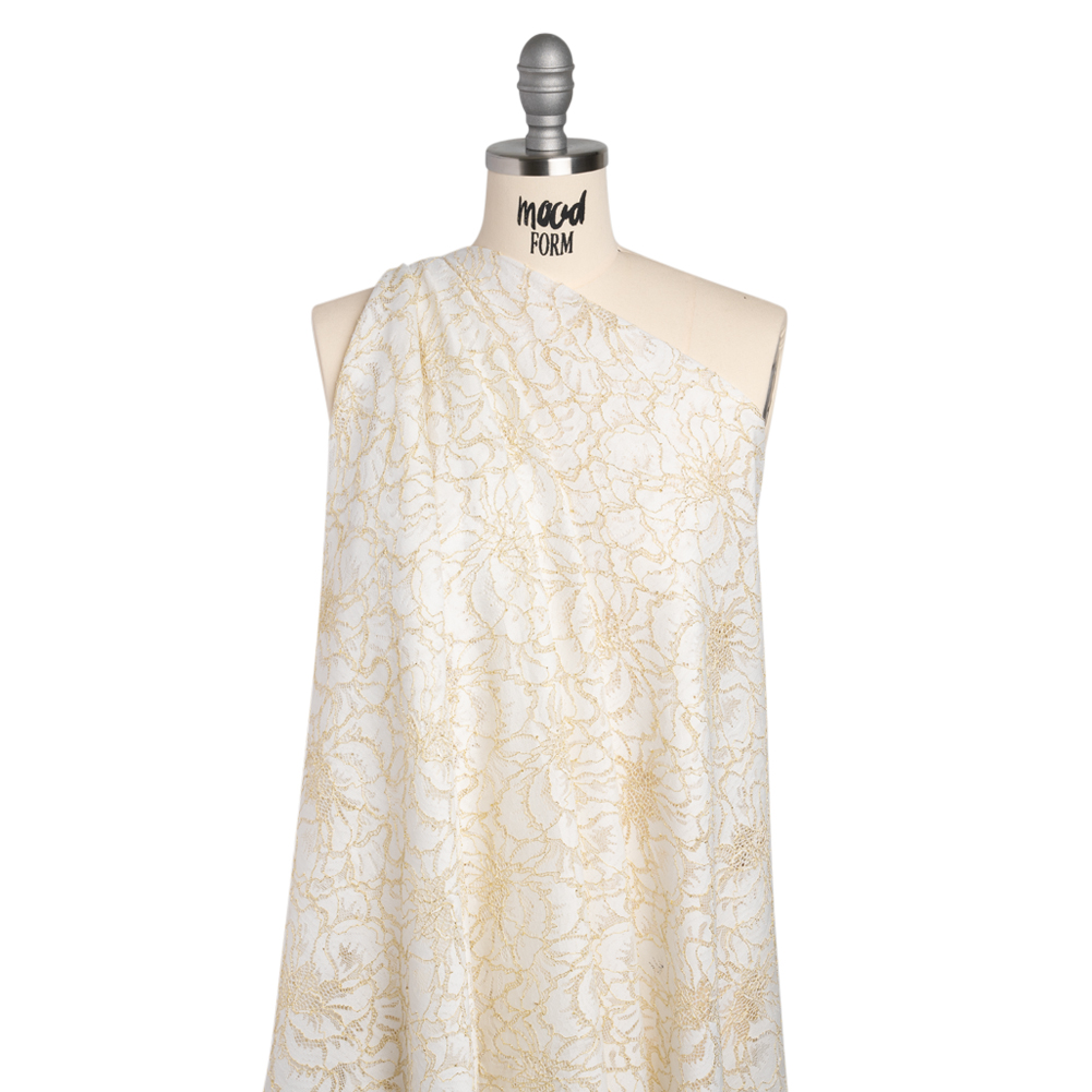 This Ivory and Gold Bold Blooming Florals Stretch Metallic Corded Lace with Finished Edges is blooming with project possibilities—featuring a tactile hand and fluid, flexible drape.Suggested Projects: Blouses, Skirts, Dresses, LingerieContent: 90% Nylon, 5% Lurex, 5% SpandexStretch: 25% WarpwiseOpacity: SheerIn an ivory hue, flowers bloom across this corded lace panel, complete with finished edges. This particular fabric has a tactile hand—thanks to the thin metallic gold cords running over the design—and features a fluid and flexible drape. With a slight stretch through the warp, this lace lends itself wonderfully to bodycon and loose, flowing silhouettes alike. Use it to create elegant gowns with long trains, mock-collar blouses, flowing skirts, or some lavish lingerie. Due to the nature of lace, some portions of this fabric are open so a lining may be desired for opacity.