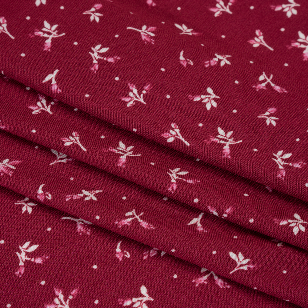 This Ditsy and Dots Stretch Modal Jersey is the berry best choice for truly luxurious loungewear—featuring a soft, smooth hand and fluid drape.Suggested Projects: Dresses, Skirts, Tops, PantsContent: 93% LMOD, 7% SpandexStretch: 75% All-WayOpacity: TranslucentDelicate pink and white ditsy florals and dots dance across a cranberry backdrop, adding charm to this breathable modal knit. Perfect for warm-weather wear and transitional layers alike, its ultra-soft feel and generous all-way stretch move effortlessly with you. From breezy skirts to wide-leg pants and bodycon dresses, it’s as versatile as it is comfortable. Translucent, we suggest layering over a cami or slip.