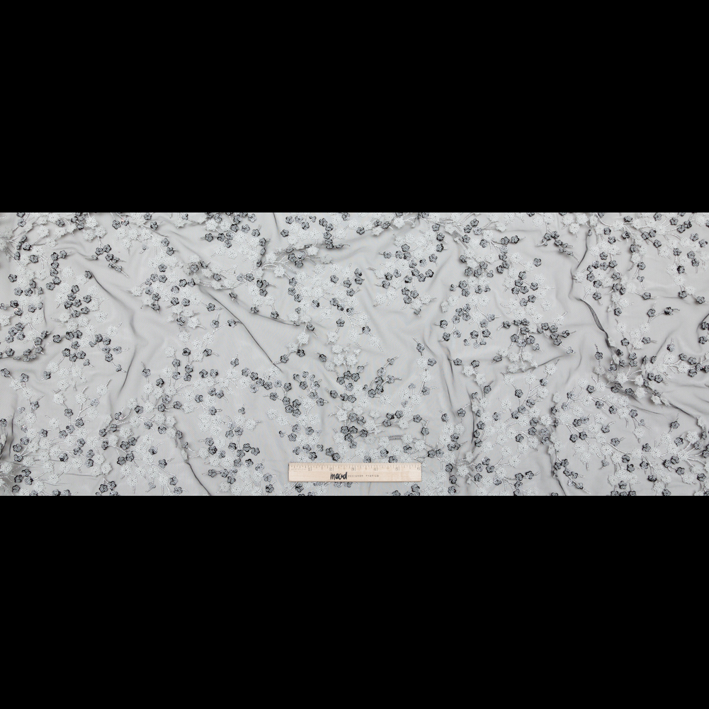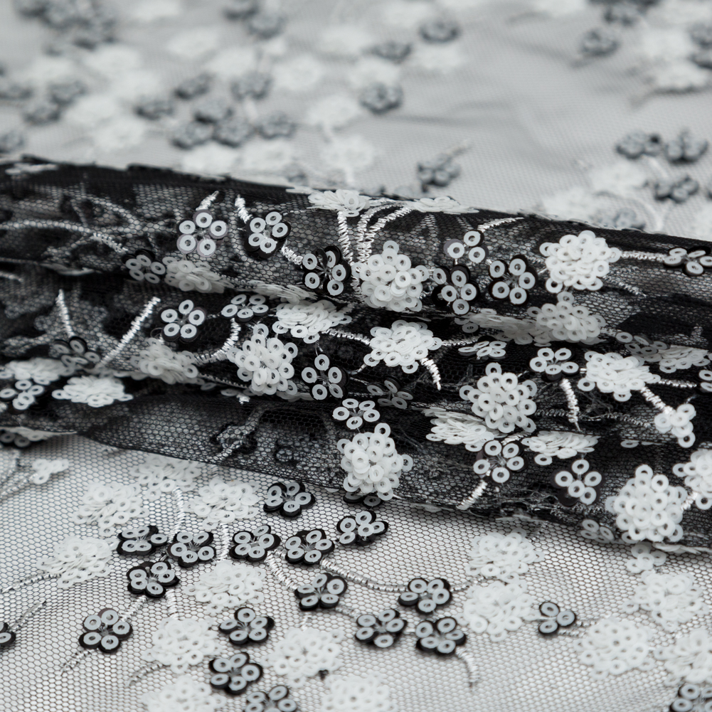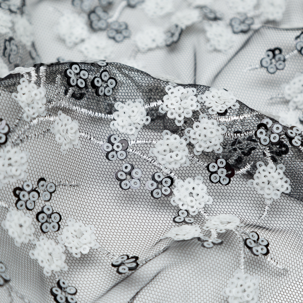 Stretch Net with Sequins - White Fancy Floral Clusters on Black