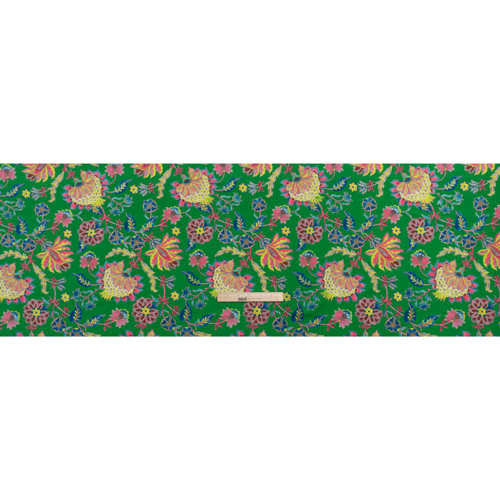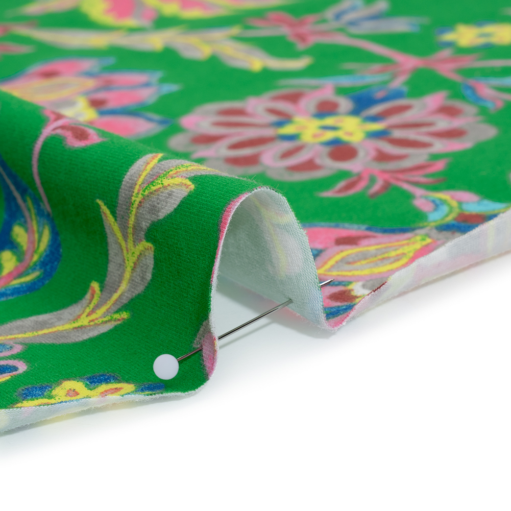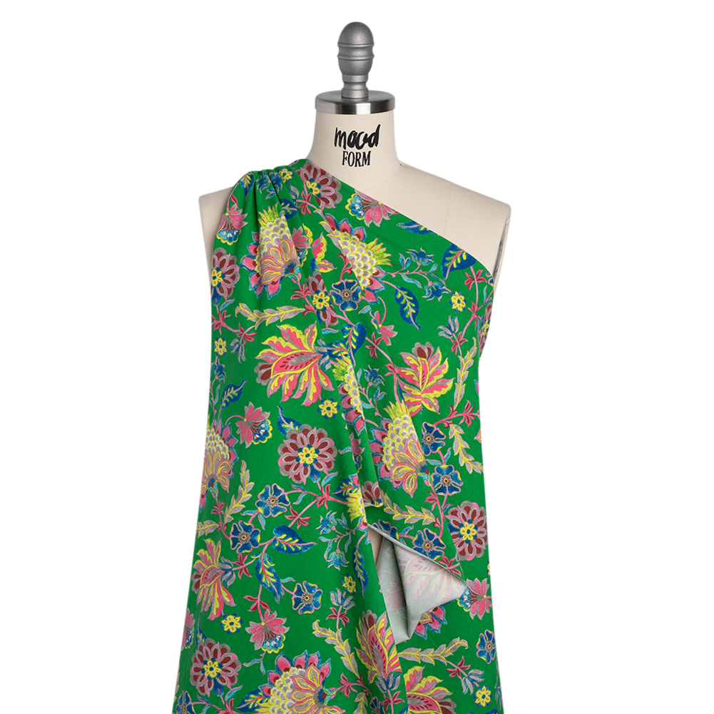 This Jacobean Floral Stretch Organic Cotton Jersey is a garden from another world—featuring a soft, smooth hand and flexible drape.Suggested Projects: Shirts, Dresses, Pants, SkirtsContent: 93% Organic Cotton, 7% SpandexStretch: 75% All-WayOpacity: Mostly OpaqueRelaxed and playful designs are just a stitch away with this organic cotton jersey, where ultramarine blue, hot pink, chartreuse, and beige Jacobean florals unfurl and bloom atop a vibrant kelly green backdrop. With a soft, smooth hand, flexible drape, and a generous 75% all-way stretch, it moves effortlessly with you—from sunny strolls in the park to quiet evenings at home. Use this fabric to create stretchy and chic short and tank top sets, bodycon dresses, t-shirts, fit-and-flare leggings, and more! Mostly opaque, a lining is not required for most applications.