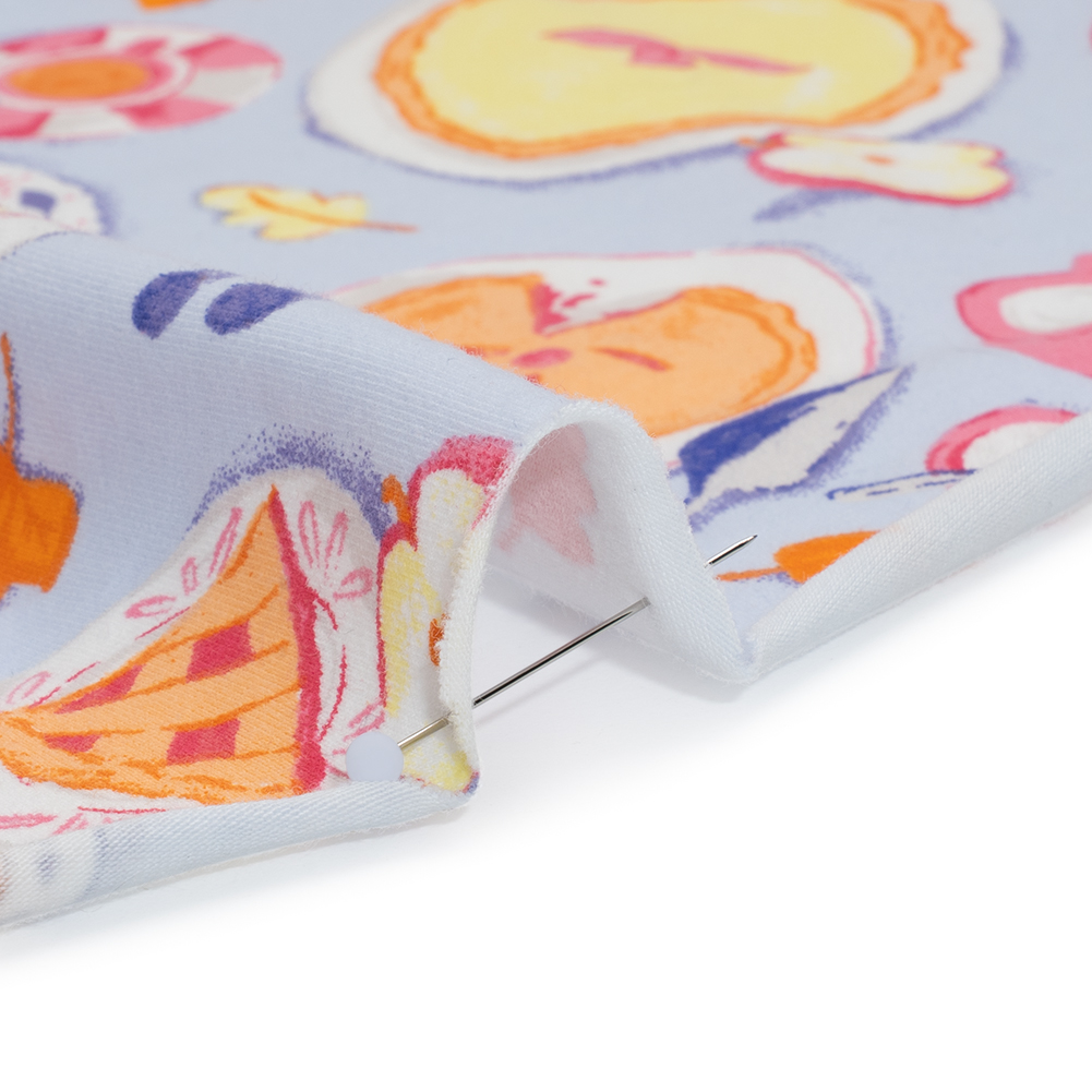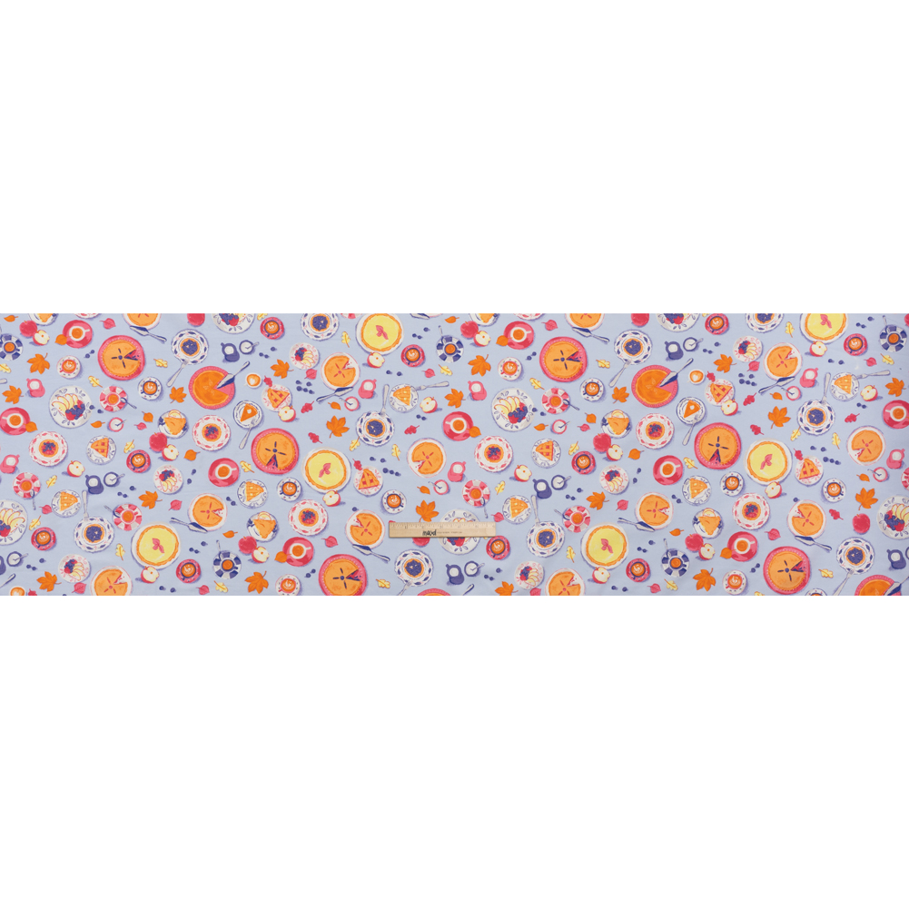 The alluring aroma of cinnamon and pumpkin spice lures you into this Fall Teaparty with Pies Stretch Organic Cotton Jersey Print—featuring a soft, smooth hand and flexible drape.Suggested Projects: Shirts, Dresses, Pants, SkirtsContent: 93% Organic Cotton, 7% SpandexStretch: 75% All-WayOpacity: Mostly OpaqueIndulge in all of autumn’s delights with this organic cotton jersey. A delicious fall tea party unfolds atop a soft light blue backdrop—inviting you to savor slices of pumpkin and blueberry pie, berry tarts, crisp apples, and steaming mugs of cider beneath the gentle rustle of turning leaves. With a soft, smooth hand, flexible drape, and a generous 75% all-way stretch, it moves effortlessly with you—from sunny strolls in the park to quiet evenings at home. Use this fabric to create stretchy and chic short and tank top sets, bodycon dresses, t-shirts, fit-and-flare leggings, and more! Mostly opaque, a lining is not required for most applications.