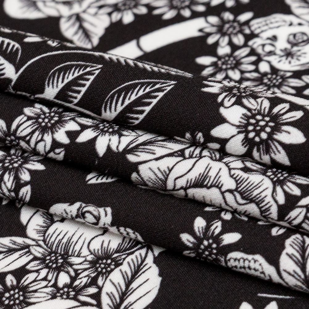 Turn your fashion dreams into reality with our Black and Star White Prophetic Dreams Stretch Polyester Crepe - because stylish foresight is always in vogue! With a dry, whippy feel, this medium-weight fabric has a crisp, textured hand and a subtle sheen. Suggested Projects: Pants, Skirts, Unconventional Suitings, DressesContent: 94&#37 Polyester, 6% ElastaneStretch: 10% Weftwise, 20% WarpwiseOpacity: Nearly OpaqueWith a natural slimming effect and a wrinkle-resistant surface, prepare to be impressed! Part of our Crow Collection, this fabric showcases a digitally printed pattern of flower-adorned skulls and reaching arms swirling against a black backdrop, accompanied by flying doves, tiny hearts, and floral motifs. Its specially constructed tactile plain weave and tightly twisted yarns (woven through the weft) create a springy surface and textured hand typical of crepe fabrics. Enhanced with elastomeric fibers, it offers approximately 10&#37 stretch weft-wise and 20&#37 stretch warp-wise. Transform this effortlessly chic fabric into stunning, fashion-forward silhouettes: Embrace body-hugging styles with gathered blouses or tanks, or opt for trendy fashion statements like a spunky jacket or blazer dress!