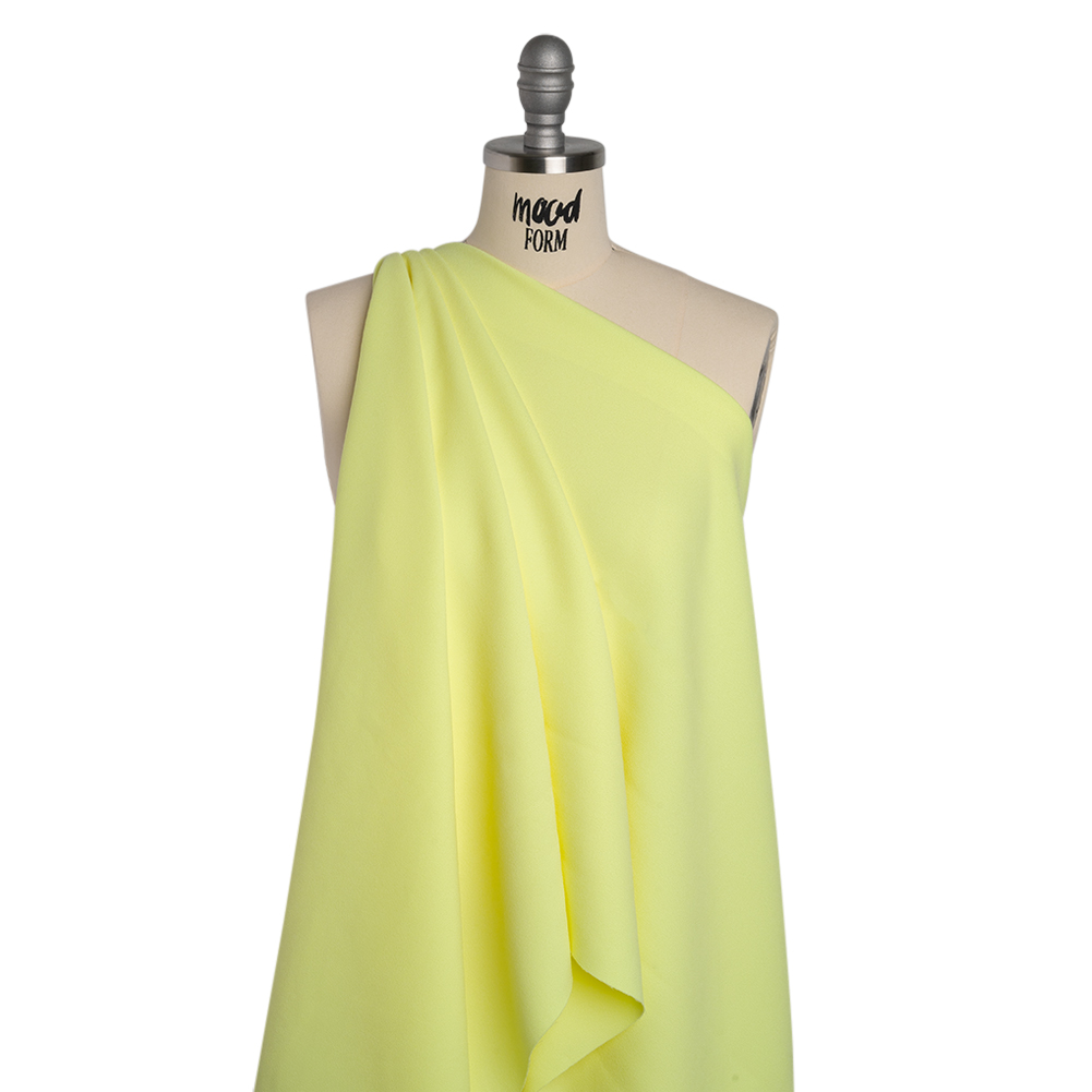 Zest up your wardrobe with this Lemon Yellow Stretch Polyester Crepe—featuring a grainy, tactile hand and fluid drape.Suggested Projects: Blazers, Pants, Dresses, ShirtsContent: 63% Polyester, 37% AcetateStretch: 20% All-WayOpacity: Mostly OpaqueA splash of this lemon yellow crepe will make your projects truly refreshing! Crepe fabrics are well-known for their signature textured surfaces, made up of tightly twisted yarns. A grainy, textured hand is met with a fluid drape and slight all-way stretch atop this dreamy crepe. Design with bouncy garments and simple day-to-night transitions in mind, crafting billowing blouses, relaxed dresses, pleated skirts, breezy button-ups, and more! Mostly opaque, a lining may be used for increased opacity and structure.
