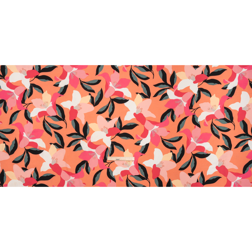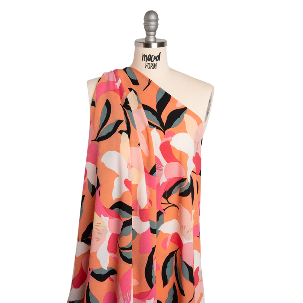 Discover a secret garden in this Floral Stretch Polyester Crepe—featuring a grainy, tactile hand and fluid drape.Suggested Projects: Dresses, Skirts, Shirts, PantsContent: 97% Polyester, 3% SpandexStretch: 10% Weftwise, 25% WarpwiseOpacity: SheerPink, white, and pale yellow lilies with gray-green and black leaves bloom atop a coral-orange background. Crepe fabrics are well-known for their signature textured surfaces, made up of tightly twisted yarns. A crisp, tactile hand is met with a fluid drape and slight all-way stretch atop this lightweight and dreamy crepe. Design with bouncy garments and simple day-to-night transitions in mind, crafting billowing blouses, relaxed dresses, pleated skirts, breezy button-ups, and more! Sheer, consider a lining for complete opacity and additional structure.