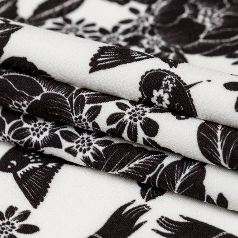 Turn your fashion dreams into reality with our Star White and Black Prophetic Dreams Stretch Polyester Crepe! With a dry, whippy feel, this medium-weight fabric has a crisp, textured hand and a subtle sheen. Suggested Projects: Pants, Skirts, Unconventional Suitings, DressesContent: 94&#37 Polyester, 6% ElastaneStretch: 10% Weftwise, 20% WarpwiseOpacity: Nearly OpaqueWith a natural slimming effect and a wrinkle-resistant surface, prepare to be impressed! Part of our Crow Collection, this fabric showcases a digitally printed pattern of flower-adorned skulls and reaching arms swirling against a black backdrop, accompanied by flying doves, tiny hearts, and floral motifs. Its specially constructed tactile plain weave and tightly twisted yarns (woven through the weft) create a springy surface and textured hand typical of crepe fabrics. Enhanced with elastomeric fibers, it offers approximately 10&#37 stretch weft-wise and 20&#37 stretch warp-wise. Transform this effortlessly chic fabric into stunning, fashion-forward silhouettes: Embrace body-hugging styles with gathered blouses or tanks, or opt for trendy fashion statements like a spunky jacket or blazer dress!