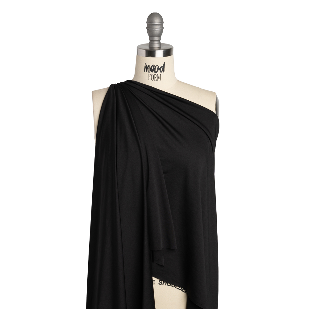 A perfect addition to the wanderlust traveler’s capsule wardrobe, this Black Stretch Polyester Jersey features a fluid drape and softly smooth hand.