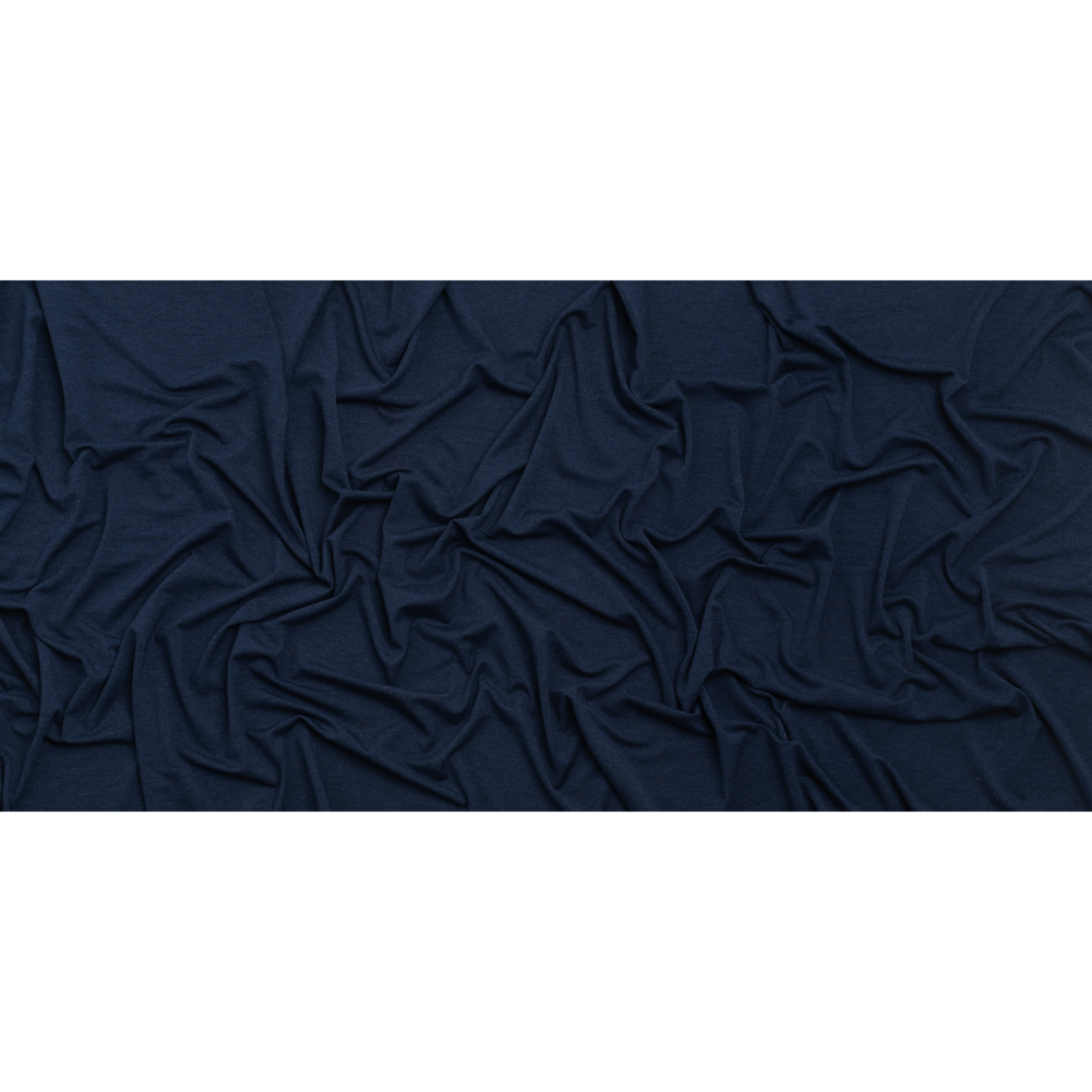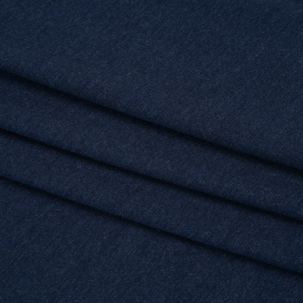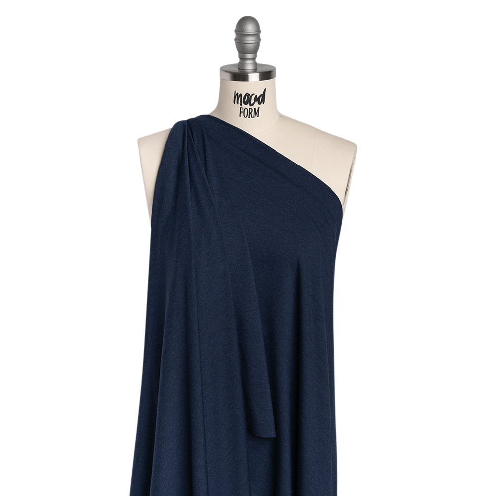 Wrap yourself in delights from the deep with this Denim Blue Heathered Stretch Polyester Jersey—featuring a soft hand and fluid drape.Suggested Projects: Shirt, Dresses, Skirts, LeggingsContent: 90% Polyester, 10% SpandexStretch: 60% All-WayOpacity: Mostly OpaqueThis heathered denim blue jersey is sure to suit all your project needs. With a super soft hand and fluid, flexible drape, it’s the perfect pick for flowy maxi dresses, wrap skirts, fit-and-flare leggings, oversized t-shirts, and all things cozy and luxurious in loungewear. Mostly opaque but gaining translucency as it is stretched, we recommend layering this comfy fabric over camis or slips.