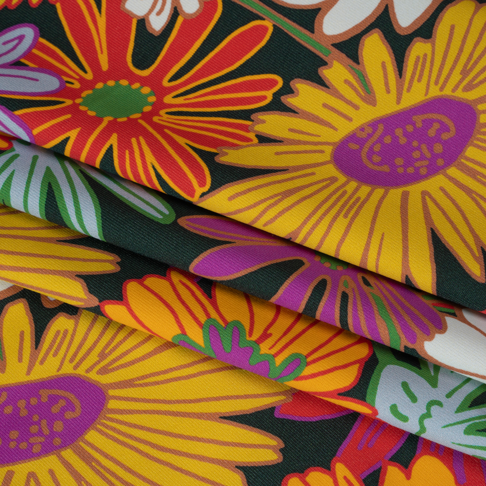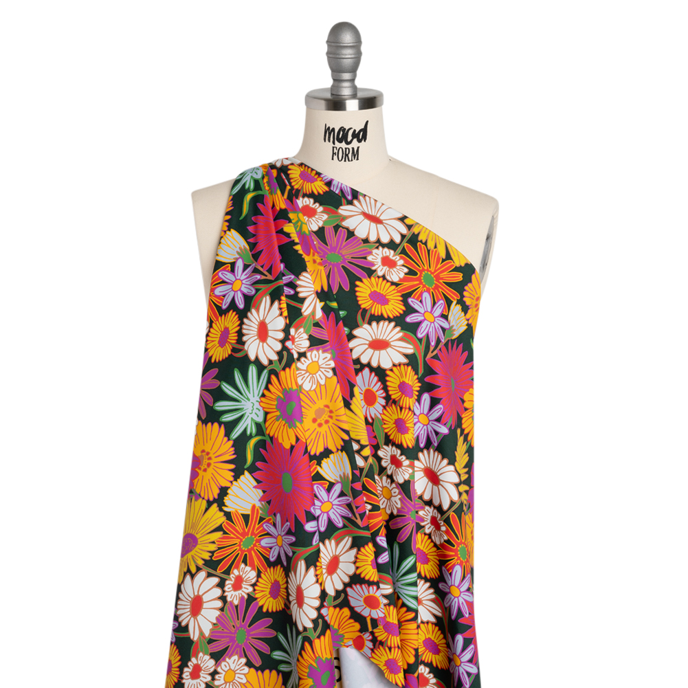 Feel the flower power in this Funky Florals Stretch Polyester Jersey, featuring a smooth, sleek hand and fluid, flexible drape.Suggested Projects: Shirts, Dresses, Shorts, PantsContent: 81% Polyester, 19% ElastaneStretch: 35% All-WayOpacity: OpaqueBoogie to the beat of your own drums with the funky floral design of this jersey. Purple, yellow, and red flowers dance across a forest green background, adding more movement to the 35% all-way stretch the fabric already boasts. A smooth, sleek hand is joined by a fluid, flexible drape, making it ideal for flowy maxi dresses, effortless tennis dresses, close-fitting leggings, bodysuits, and more! Opaque, though more translucent when stretched, a lining is not necessary for projects.