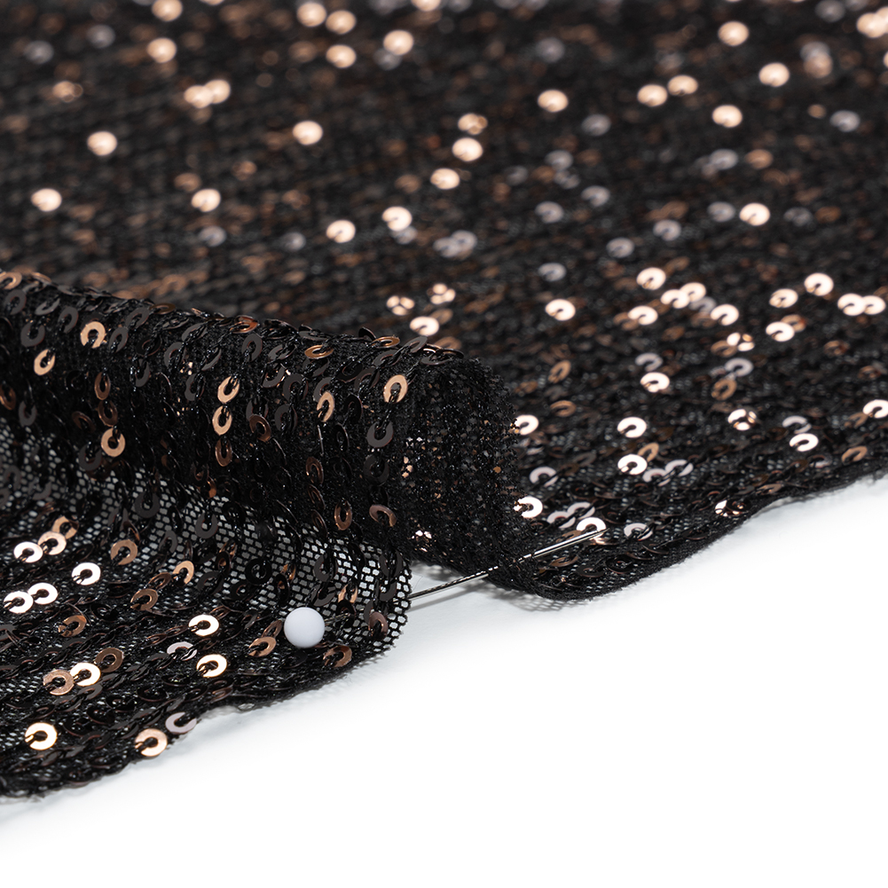 Sew designs reminiscent of old Hollywood with this Black and Gold Striped Stretch Polyester Mesh with Baby Sequins—featuring a tactile hand and fluid drape.Suggested Projects: Dresses, Skirts, Jackets, PantsContent: 97% Polyester, 3% SpandexStretch: 25% WarpwiseOpacity: SheerGleaming golden baby sequins line up in neat rows against a black mesh background. With a fluid drape and slight stretch through the warp, it’s the perfect fabric for fitted garments like bodycon dresses and mini skirts, or tailored jackets and fit and flare pants—for the performer at heart. Sheer, a lining is recommended for opacity and comfortability purposes.