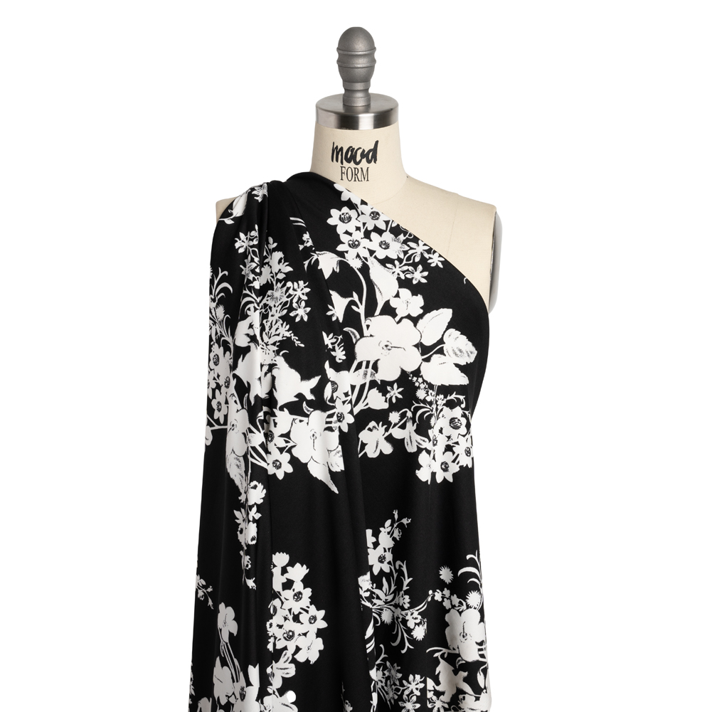 Don’t worry, this Black and White Floral Stretch Polyester Ponte is sure to last as long as a picture, featuring a sleek, cool hand and flexible drape.