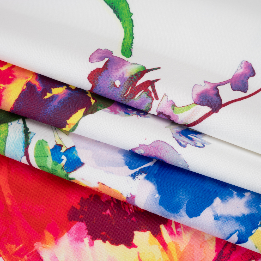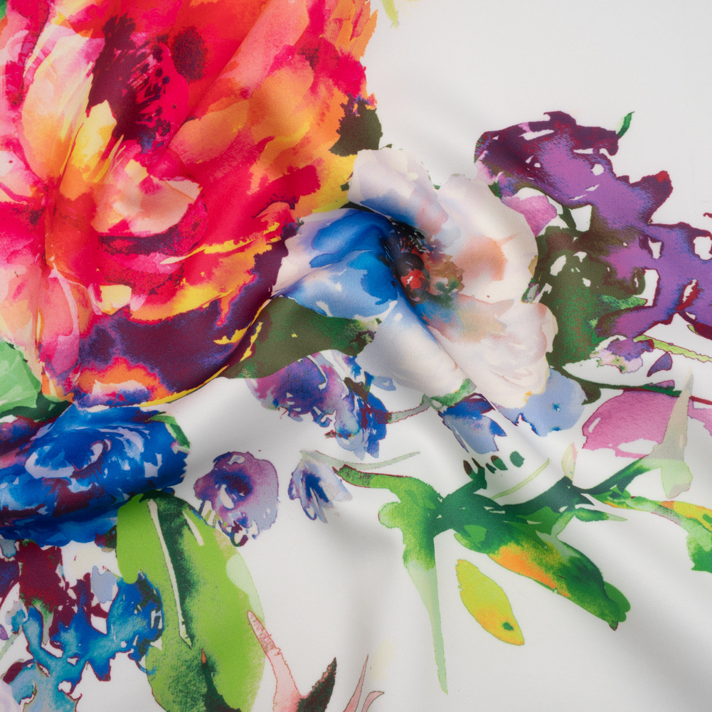 You’ll paint a pretty picture in this Painted Roses Border Stretch Polyester Scuba Knit—featuring a smooth, sleek hand and flexible drape.Suggested Projects: Swimwear, Dresses, Skirts, LeggingsContent: 95% Polyester, 5% SpandexStretch: 75% Weftwise, 20% WarpwiseOpacity: Slightly TranslucentPainted roses bloom in hues of red, yellow, blue, and pink, interspersed with their rich green leaves—imbuing your projects with the ease of a sunny summer’s day. For those who are unfamiliar with scuba knits (which are the fashion-friendly alternative to neoprenes), they are widely used for swimwear and laptop covers as it maintains its flexibility over a wide variety of temperatures. Create sleek body forming silhouettes with its moderate stretch through the weft (and a little extra through the warp) and smooth, sleek hand. Its drape is flexible for fit-and-flare pieces as well! Craft trendy bikinis, one-pieces, and wetsuits, or take it out of the water with chic fit-and-flare dresses, pencil skirts, and leggings. Slightly translucent, we recommend adding a lining for complete opacity.