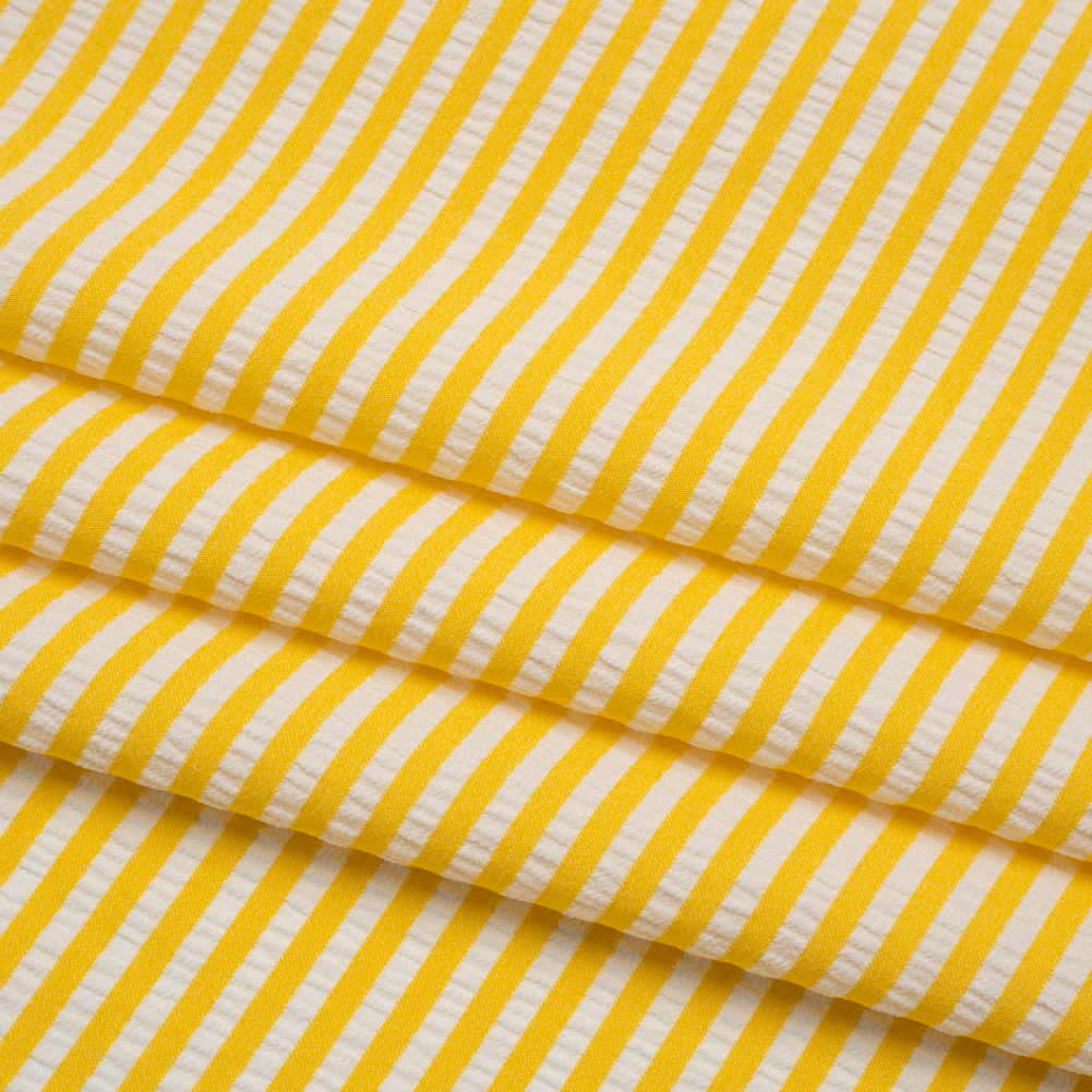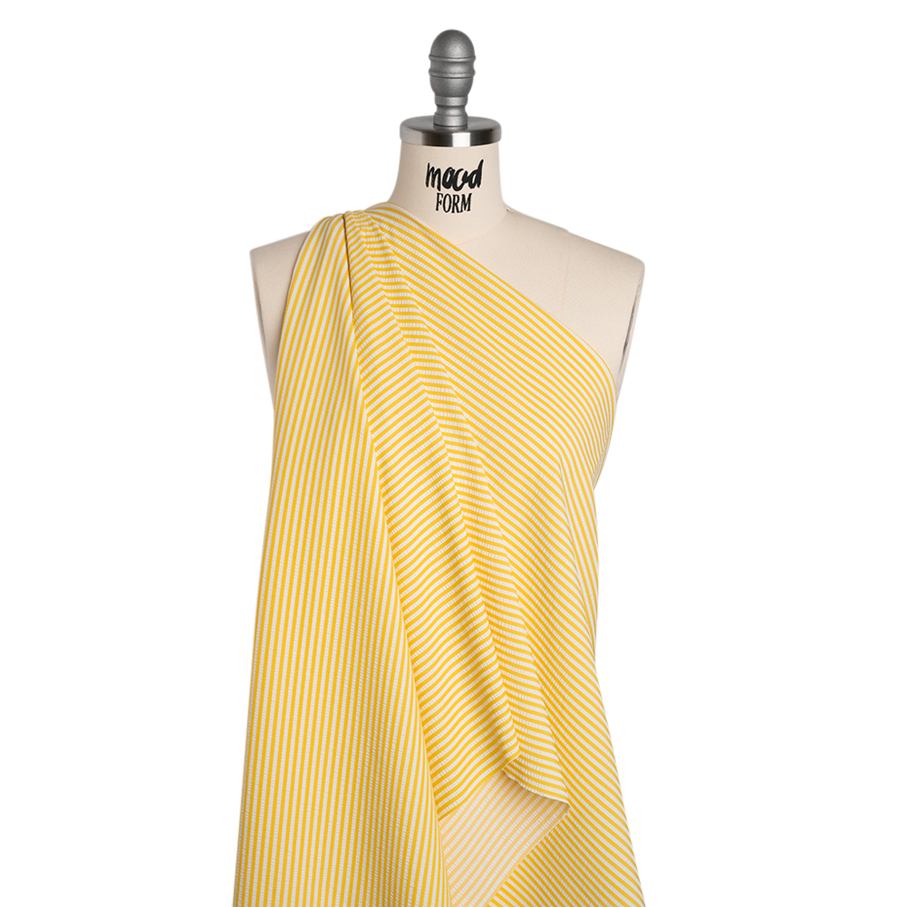 This Lemon Yellow and White Candy Striped Stretch Polyester Seersucker will never sour—featuring a tactile hand and bouncy drape.Suggested Projects: Blouses, Dresses, Summer Suits, SkirtsContent: Polyester, ElastaneStretch: 25% All-WayOpacity: TranslucentStriped with lemon yellow and white lines, this seersucker is delightfully puckered in hand, perfect for the sewist looking to play with textures. Lightweight and bouncy with a 25% all-way give, we suggest fashioning blouses, rompers, sundresses, or even summer suits. Translucent, a lining may be added for additional modesty and structure but isn't always necessary.