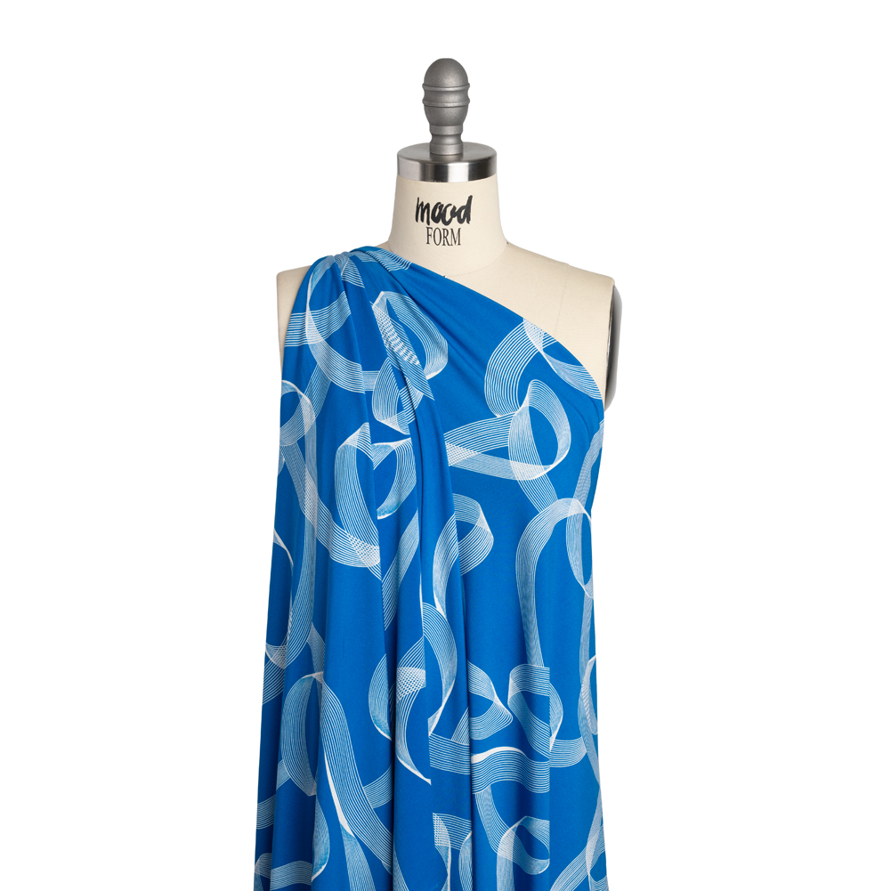This Looping Lines Stretch Polyester Tricot is the write choice for your next project—featuring a smooth, cool hand and fluid, flexible drape.Suggested Projects: Swimwear, Sports Bras, Leggings, DressesContent: 95% Polyester, 5% SpandexStretch: 80% Weftwise, 25% WarpwiseOpacity: TranslucentGraceful, calligraphy-like white lines sweep and loop in an artistic dance across a bright blue background. With a subtle sheen and smooth, cool hand, it’ll glint under the sun while ensuring you don’t overheat. Featuring a fluid, flexible drape and 80% stretch through the weft and slight stretch through the warp, this tricot is ideal for both activewear and swimwear applications. Use it to craft everything from stylish one-piece bathing suits to workout leggings to trendy tennis dresses! Translucent under the light, a lining may be suggested for most applications.