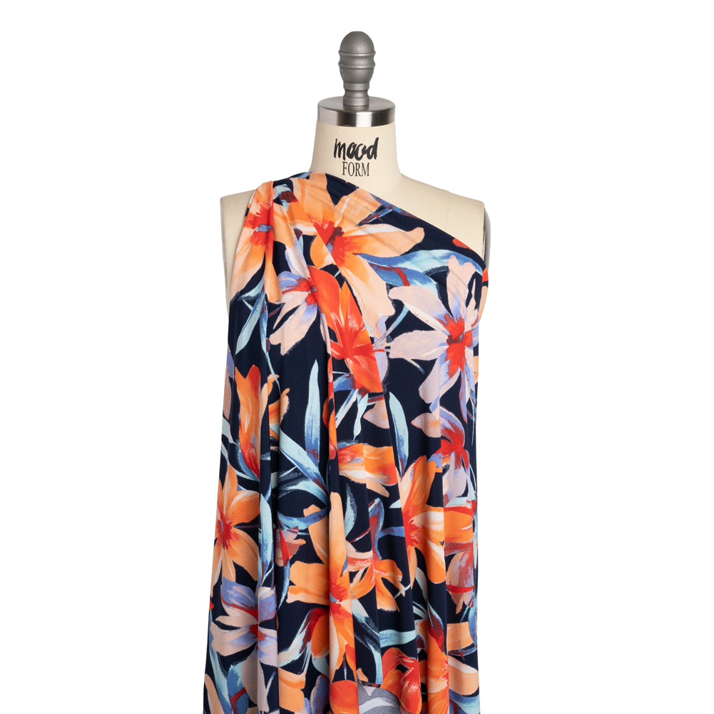 Long days in the studio are a breeze with this Painterly Flowers Stretch Polyester Tricot—featuring a smooth, cool hand and fluid, flexible drape.Suggested Projects: Swimwear, Sports Bras, Leggings, DressesContent: 95% Polyester, 5% SpandexStretch: 80% Weftwise, 25% WarpwiseOpacity: TranslucentWith an artist’s hand, and an artist's eye, orange, bright red, aqua, and periwinkle flowers are painted across a navy blue background. With a subtle sheen and smooth, cool hand, it’ll glint under the sun while ensuring you don’t overheat. Featuring a fluid, flexible drape, 80% stretch through the weft, and slight stretch through the warp, this tricot is ideal for both activewear and swimwear applications. Use it to craft everything from stylish one-piece bathing suits to workout leggings to trendy tennis dresses! Translucent, a lining is suggested for most applications.