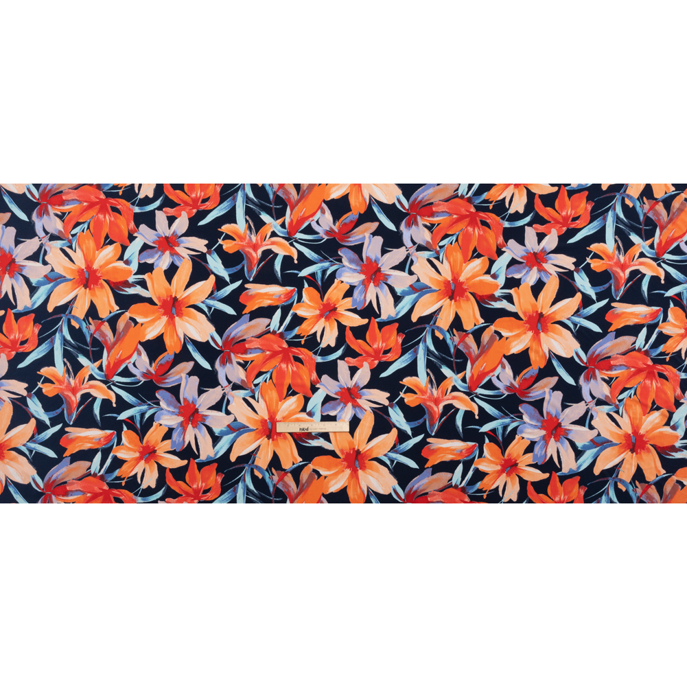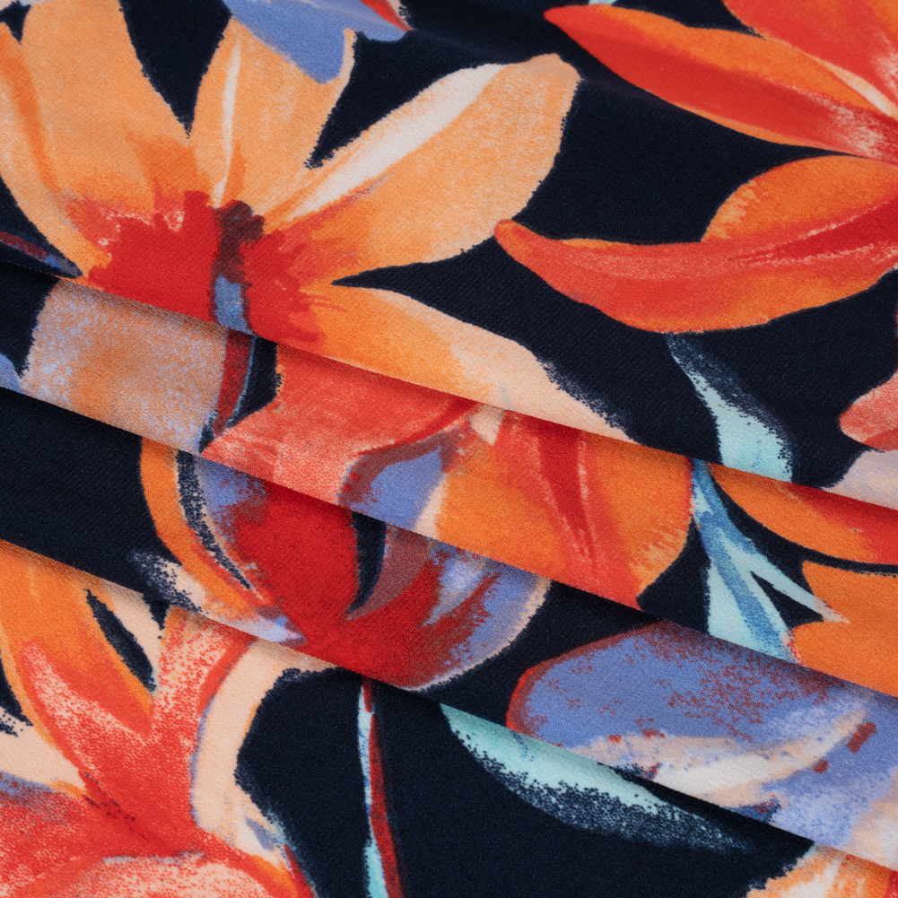 Stretch Polyester Tricot - Navy, Orange and Aqua Blue Painterly Flowers - Designer Deadstock