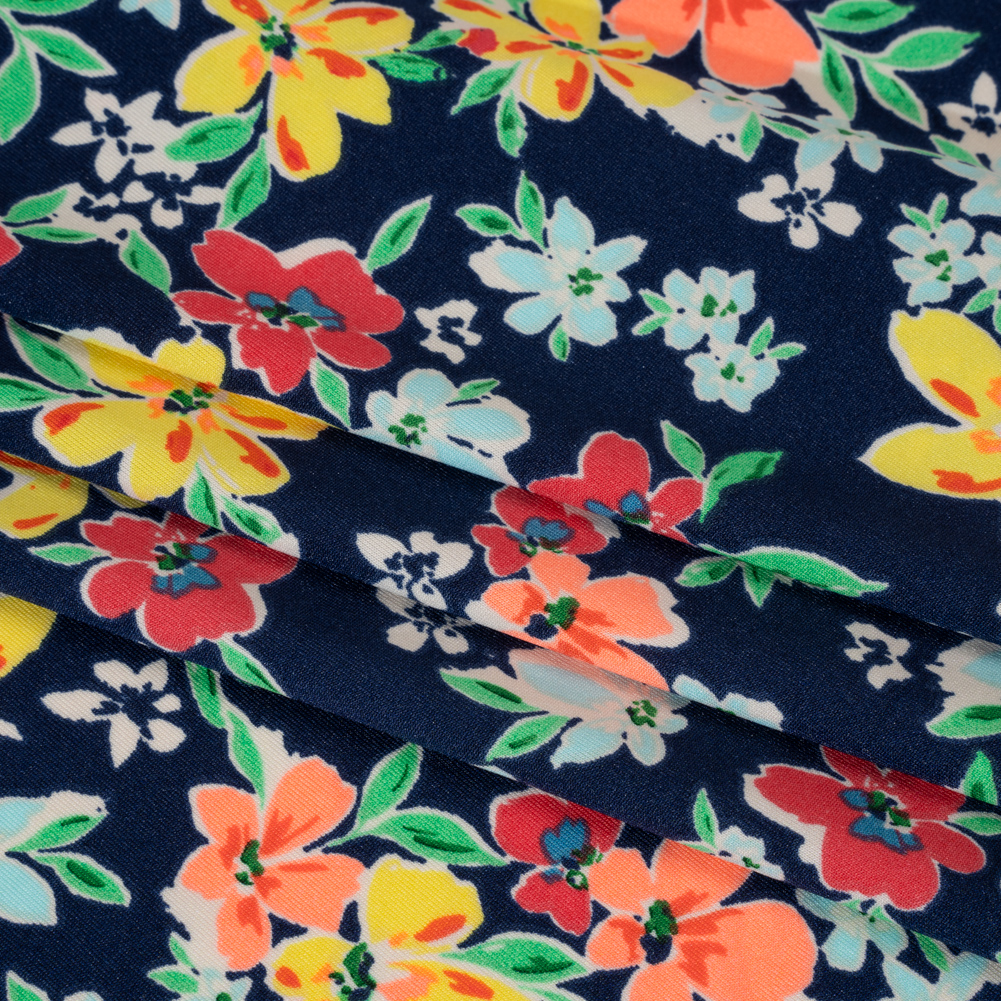 Float along the lazy river in this Floral Stretch Polyester Tricot, featuring a smooth, cool hand and fluid, flexible drape.Suggested Projects: Swimwear, Sports Bras, Leggings, DressesContent: 95% Polyester, 5% SpandexStretch: 50% Weftwise, 30% WarpwiseOpacity: TranslucentBright orange, yellow, aqua, green, and white flowers float atop a deep, navy blue sea. With a subtle sheen and smooth, cool hand, it’ll glint under the sun while ensuring you don’t overheat. Featuring a fluid, flexible drape and 50% stretch through the weft and moderate stretch through the warp, this tricot is ideal for both activewear and swimwear applications. Use it to craft everything from stylish one-piece bathing suits to workout leggings to trendy tennis dresses! Translucent, a lining is suggested for most applications.