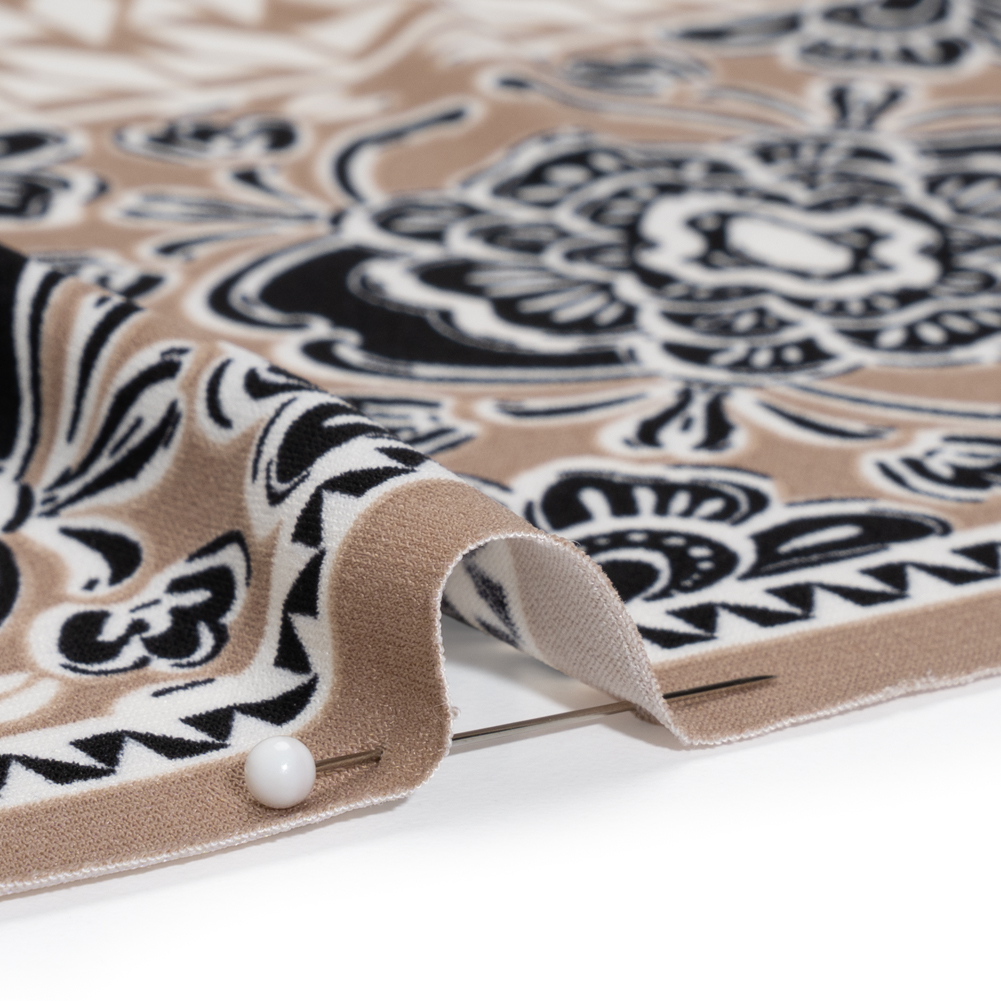 Stretch Polyester Tricot Panel - Beige, Black and White Floral and Geometric - Designer Deadstock