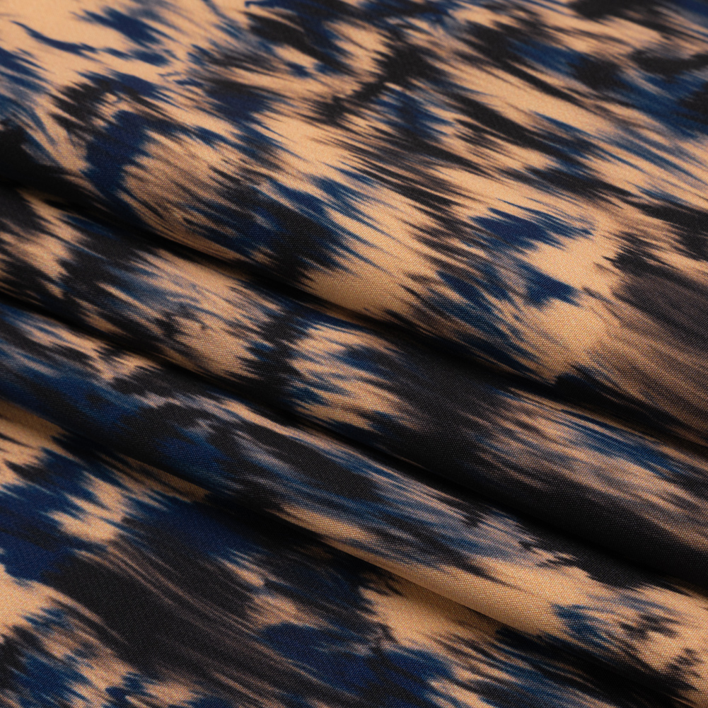 Stretch Polyester Woven Print - Blue and Beige Abstract Ikat - Mood Exclusive Shifting Sands