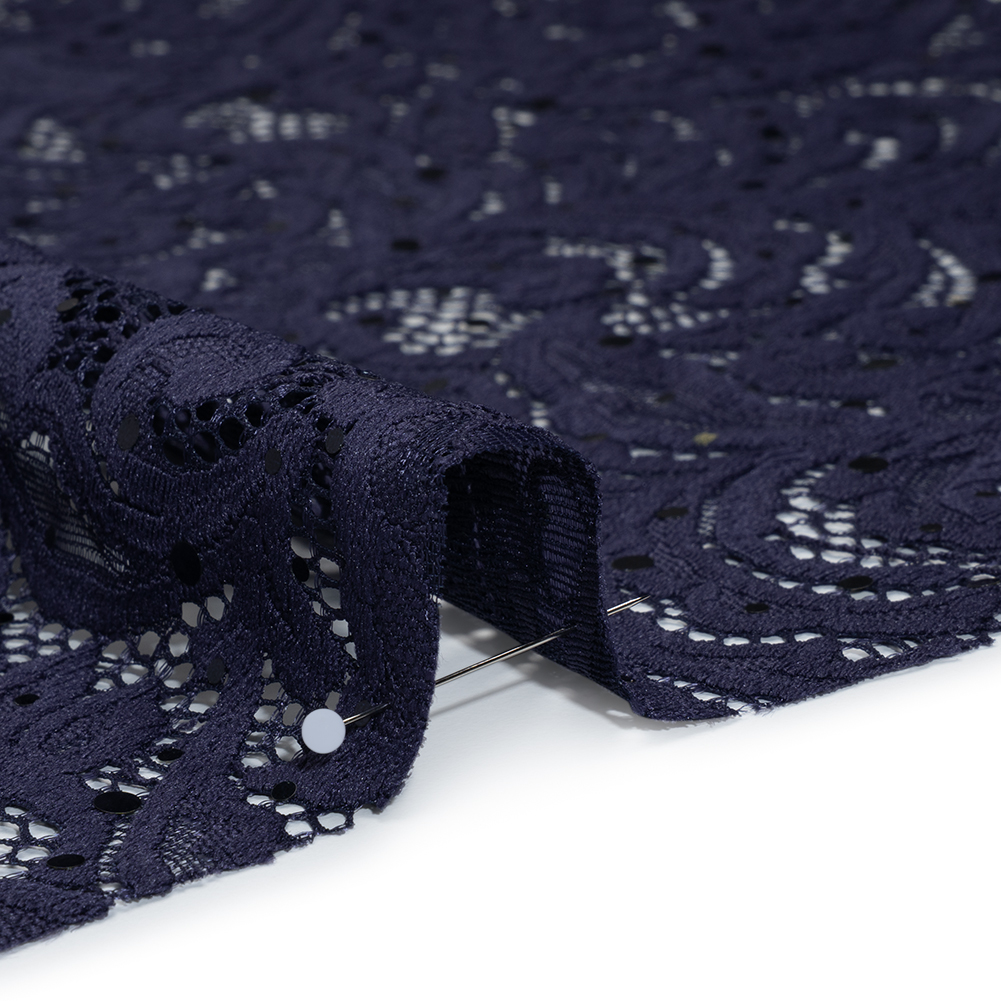 Like moonlit vines in motion, this Navy Fancy Leaves and Flowers Stretch Raschel Lace with Metallic Spots shimmers with secret enchantment—featuring a tactile hand and fluid, flexible drape.Suggested Projects: Gowns, Dresses, Skirts, PantsContent: 95% Nylon, 5% SpandexStretch: 25% WarpwiseOpacity: SheerThe looping leaves-and-flowers design of this navy blue raschel lace will have you looking and feeling your most glamorous. A gentle stretch through the warp paired with a fluid, flexible drape makes it just as suited for body-hugging shapes as it is for sweeping silhouettes—with glinting metallic navy blue spots catching the light from every angle. With its fairytale floral motif, we imagine red-carpet-ready gowns, cascading waterfall skirts, chic bodysuits, dramatic bell-bottoms, and more. Sheer by nature, it can shine as a panel or be paired with a lining for added opacity.