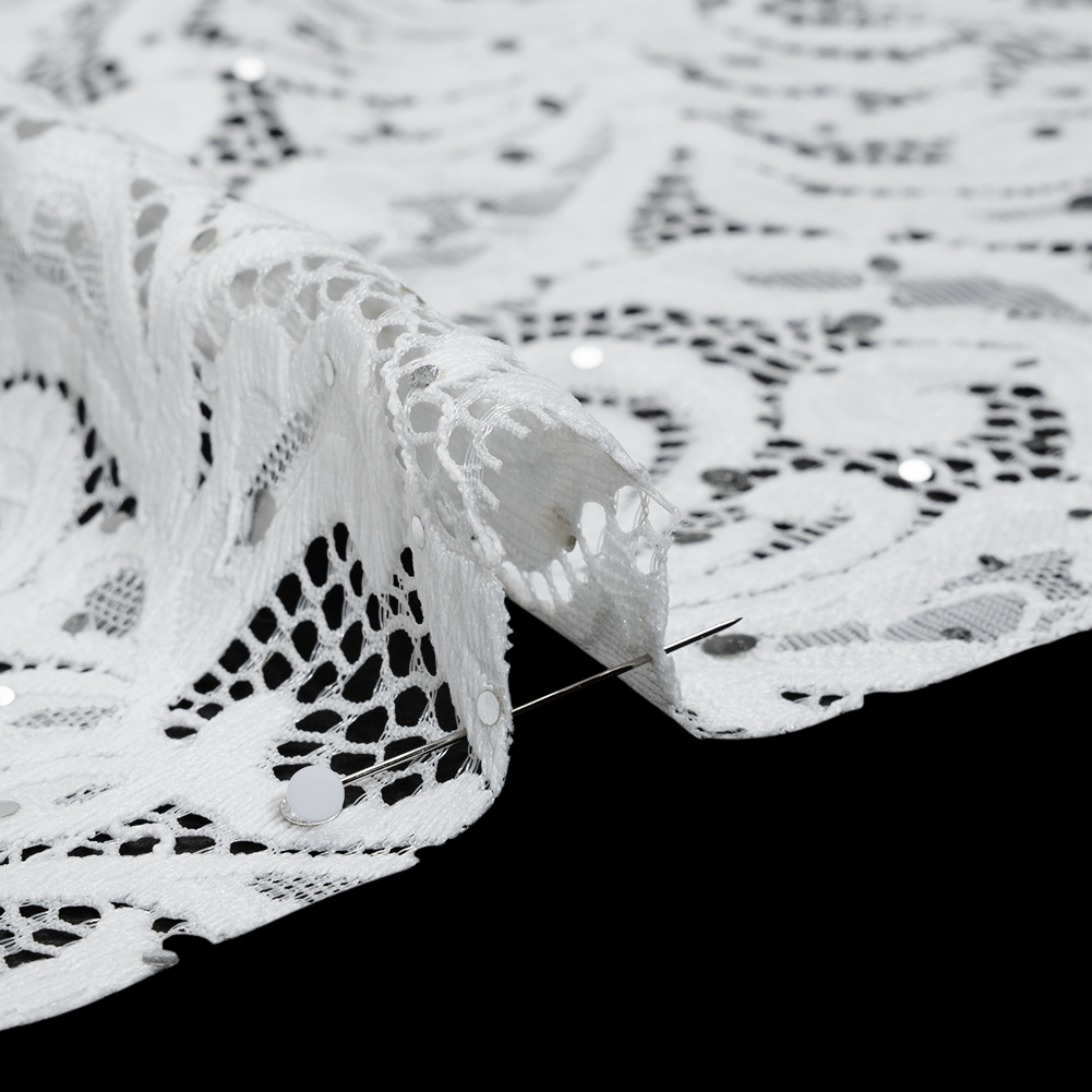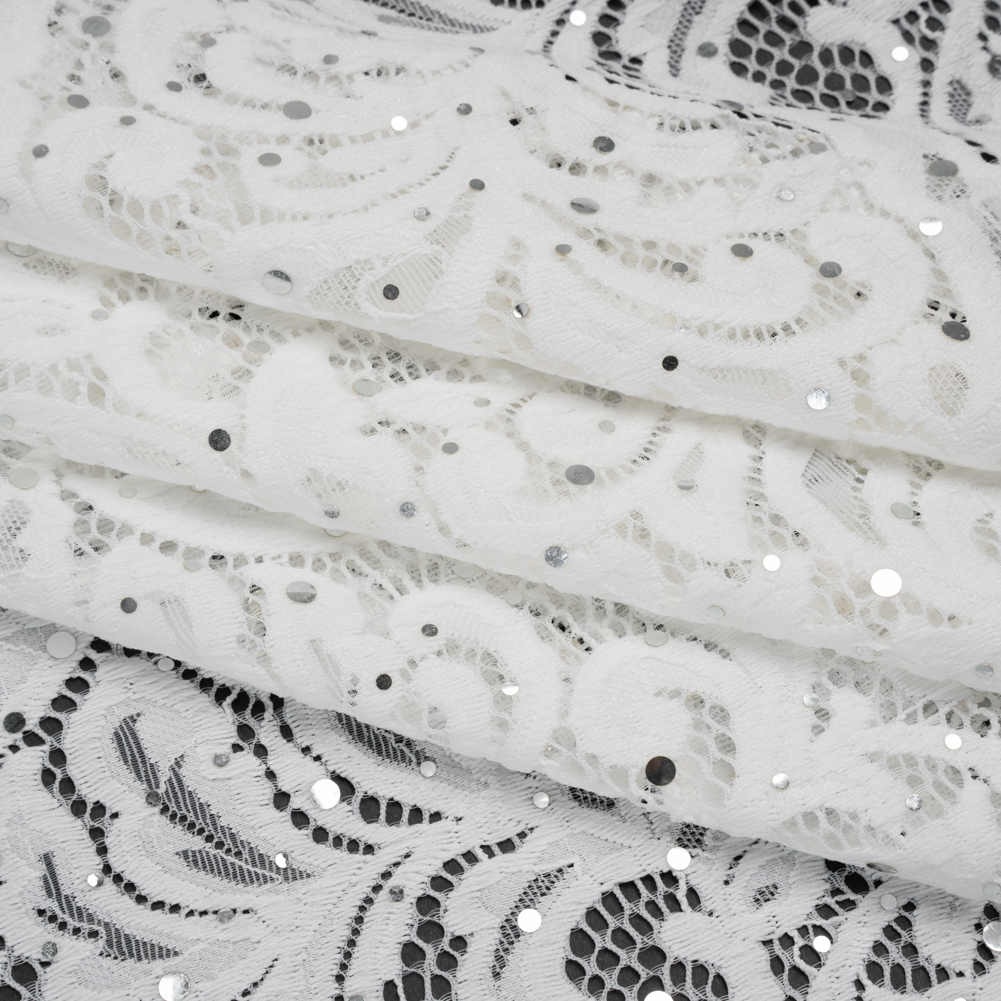 Reflect the light and attract the eye when wearing this Silver and Ivory Fancy Leaves and Flowers Stretch Raschel Lace with Metallic Spots—featuring a tactile hand and fluid, flexible drape.Suggested Projects: Gowns, Dresses, Skirts, PantsContent: 95% Nylon, 5% SpandexStretch: 25% WarpwiseOpacity: SheerThe looping leaves-and-flowers design of this bright white raschel lace will have you looking and feeling your most glamorous. A gentle stretch through the warp paired with a fluid, flexible drape makes it just as suited for body-hugging shapes as it is for sweeping silhouettes—with glinting metallic silver spots catching the light from every angle. With its fairytale floral motif, we imagine red-carpet-ready gowns, cascading waterfall skirts, chic bodysuits, dramatic bell-bottoms, and more. Sheer by nature, it can shine as a panel or be paired with a lining for added opacity.