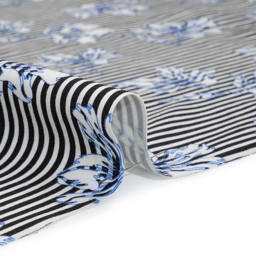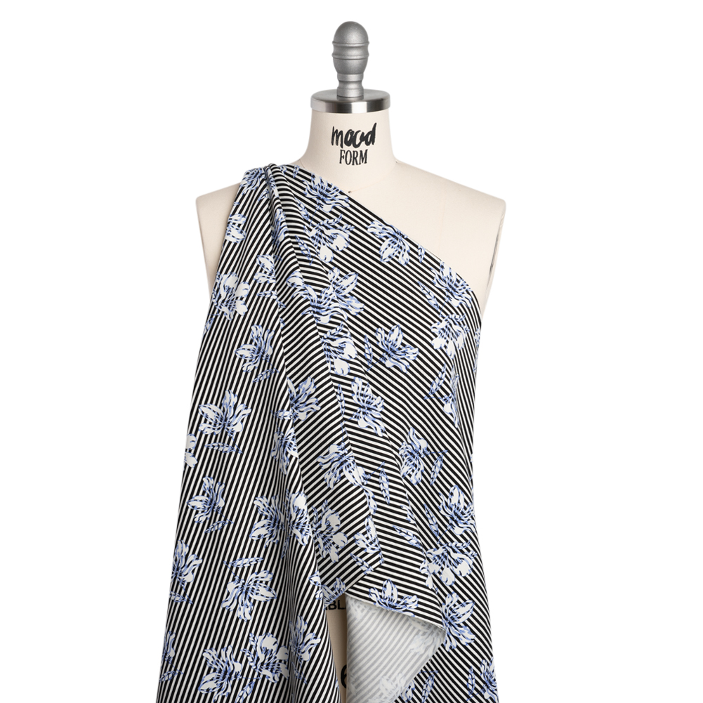 1 review for Stretch Rayon and Polyester Twill – Black, White and Blue Flowers over Stripes – Deadstock