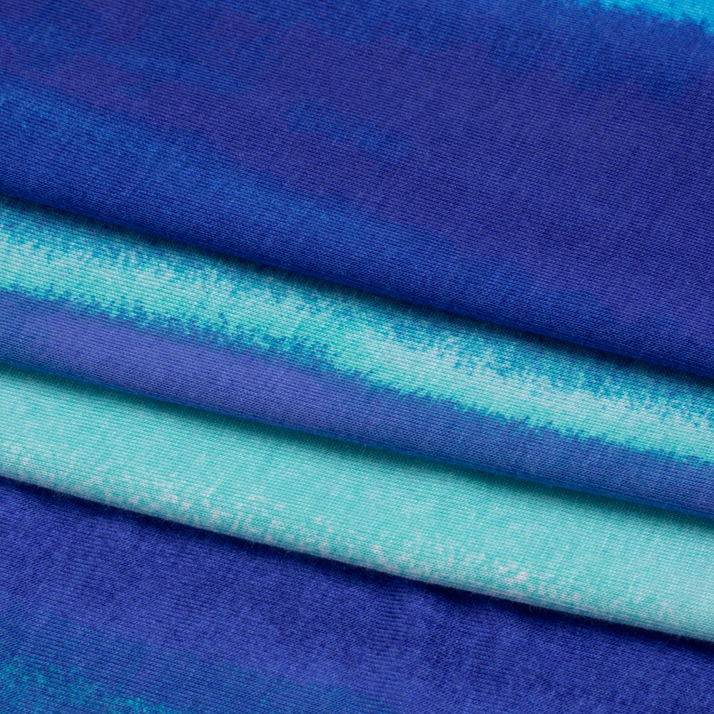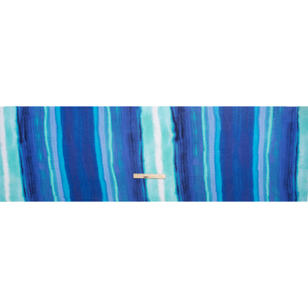 Fluid serenity comes with this luxe Rayon Jersey, in the form of a silky-soft hand and generous stretch to make the most comfortable ensembles.Suggested Projects: dresses, leggings, tops, lightweight cardigansContent: 95% rayon, 5% spandexStretch: 75% widthwise and 35% lengthwiseOpacity: Mostly opaqueEvoking sea salt air, this jersey sends your wardrobe on vacation, displaying hazy stripes of blue tones. From morning lattes in pajama sets to evening grocery trips in cardigans, jerseys make casual comfort easy. Lazy days are enhanced by a subtle luster, buttery-soft hand, and fluid drape, creating a comfort so good that you’ll redefine what it means to relax in style. So slide into your most comfortable undergarments, slip into your go-to tee, and let’s start lounging. Please note that this fabric is semi-transparent.Our professional comfort connoisseurs want to give you these sewing tips for jersey:Prevent overstretching by cutting with a rotary blade, remembering to cut along the grain.With a ballpoint needle, use a zig-zag or lightning stitch.