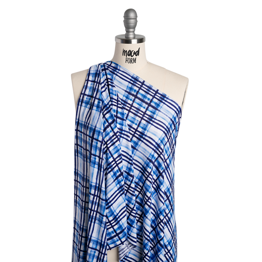 Blend business-chic with luxe loungewear when using this Painterly Plaid Stretch Rayon Jersey Print—featuring a soft, smooth hand and fluid drape.Suggested Projects: Dresses, Leggings, Tops, Lightweight CardigansContent: 95% Rayon, 5% SpandexStretch: 75% Weftwise, 25% WarpwiseOpacity: TranslucentA navy blue and blue plaid design is painted atop the white canvas of this jersey. With a soft, smooth hand and fluid drape, it yearns to follow you wherever the day may take you—whether that’s running errands or lounging around the house. With a moderate all-way stretch, enjoy a morning mug of coffee in pajama sets, grocery trips in cardigans, or engage your inner artist with slouchy, oversized t-shirts. Translucent, we recommend using a lining for complete opacity.