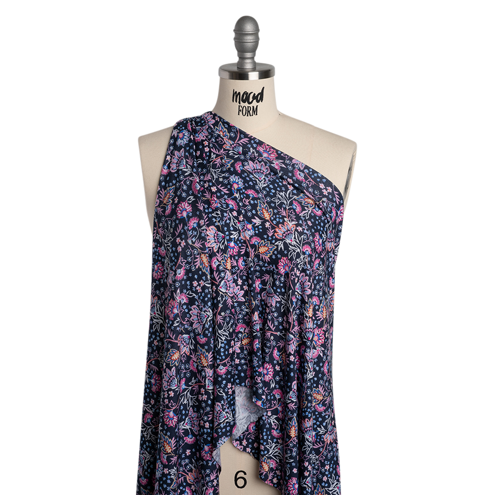 This Ornamental Floral Stretch Rayon Jersey Print looks like a moonlit garden in full bloom—featuring a soft, smooth hand and flexible drape.