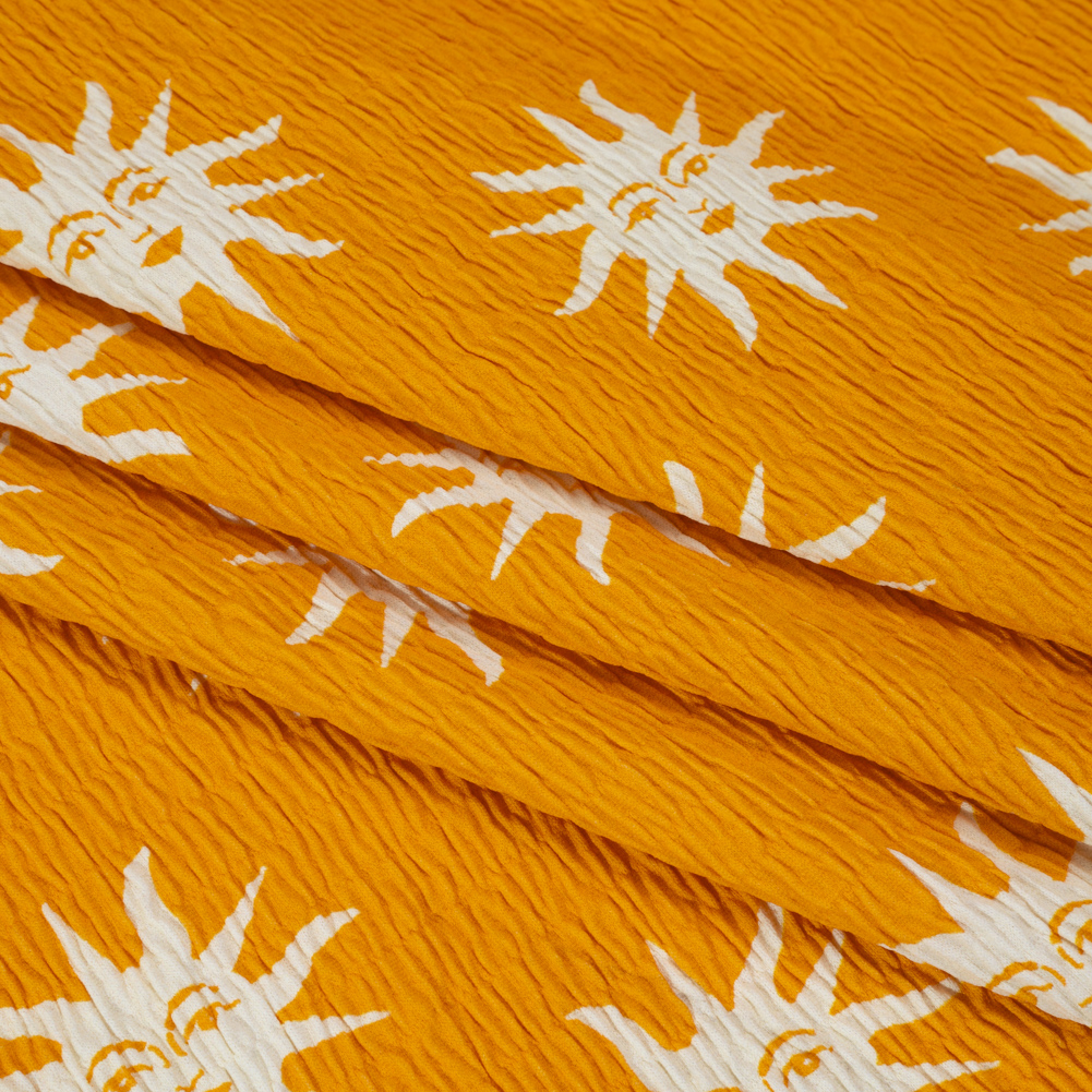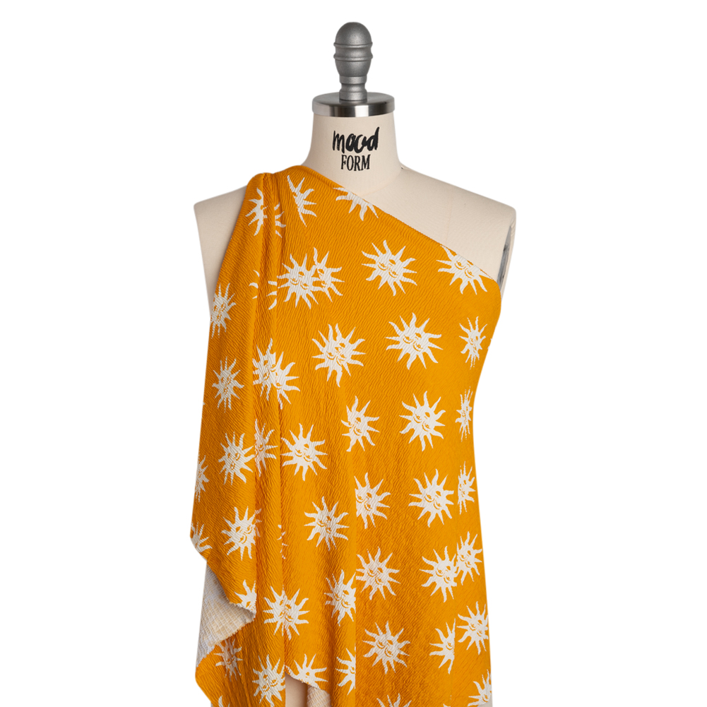 Be ready to face the day in this Suns with Faces Stretch Ruched Nylon Jersey, featuring a soft, scrunched face and fluid drape.Suggested Projects: Shirts, Shorts, Dresses, SkirtsContent: Nylon, ElastaneStretch: 75% WeftwiseOpacity: TranslucentWhite suns with faces shine atop this marigold yellow ruched jersey. A 75% stretch through the weft and soft, scrunched face elevate this nylon jersey to endlessly comfortable heights. With its fluid drape, we envision flowing maxi-skirts, off-shoulder tops with puffy sleeves, tight-fitting tube tops, bloomer shorts, and more! Though translucent, a lining is not necessary for most applications.