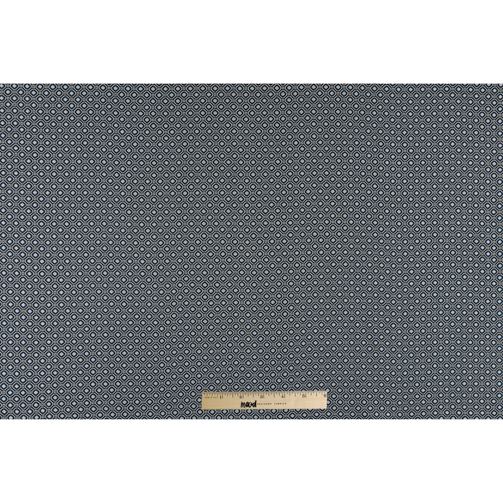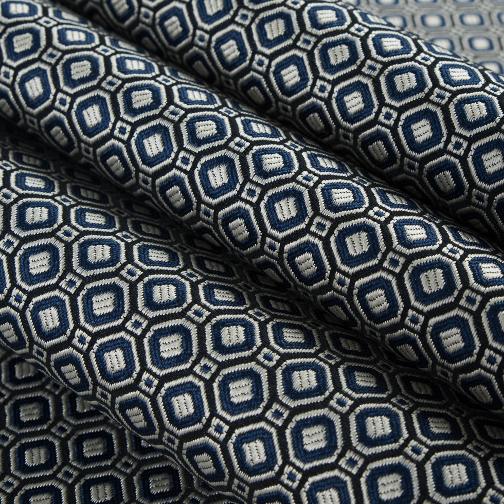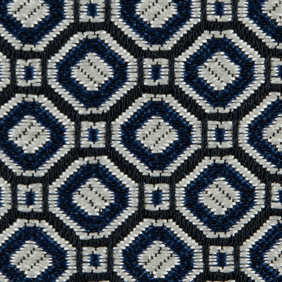 Introducing an eye-catching fabric we're sure you'll obsess over. Here is a strong blue & silver geometric jacquard sturdy in structure and durable with construction. Providing a soft surface texture, this brocade also contains a weight to it with a slightly crisper drape. Laying at 59" in width and with a hint of glam from the metallic threads through-out, use this fabric for beautiful tailored dresses, trench coats, or home decor purposes such as pillows and accents pieces.