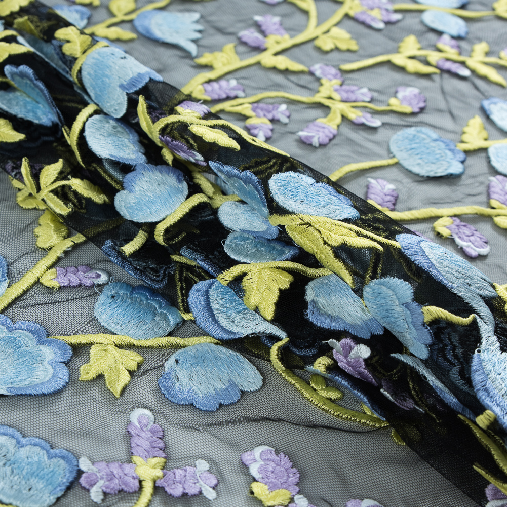 Sunny Lime, Orchid Bloom and Blue Bell Floral Embroidered Lace on Black Tulle