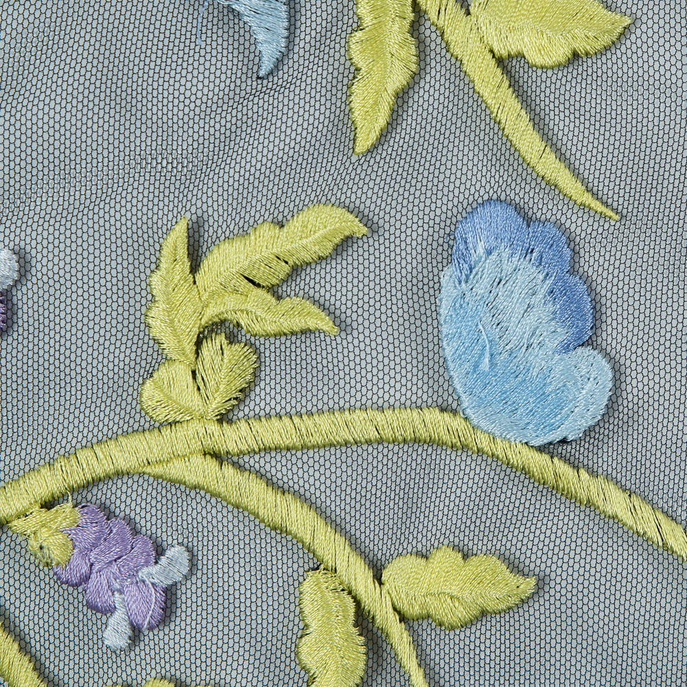 Boldly blooming from the dark, take home this Sunny Lime, Orchid Bloom and Blue Bell Floral Embroidered Lace on Black Tulle! Bright threads create thickly embroidered flowers and vines that grow over a black tulle creating a dreamy quality. Let it flow into stunning gowns and evening dresses that reference a breezy nighttime walk through a garden. Mystify in full voluminous dresses as well! Note that there is a bit of stretch through its weft.
