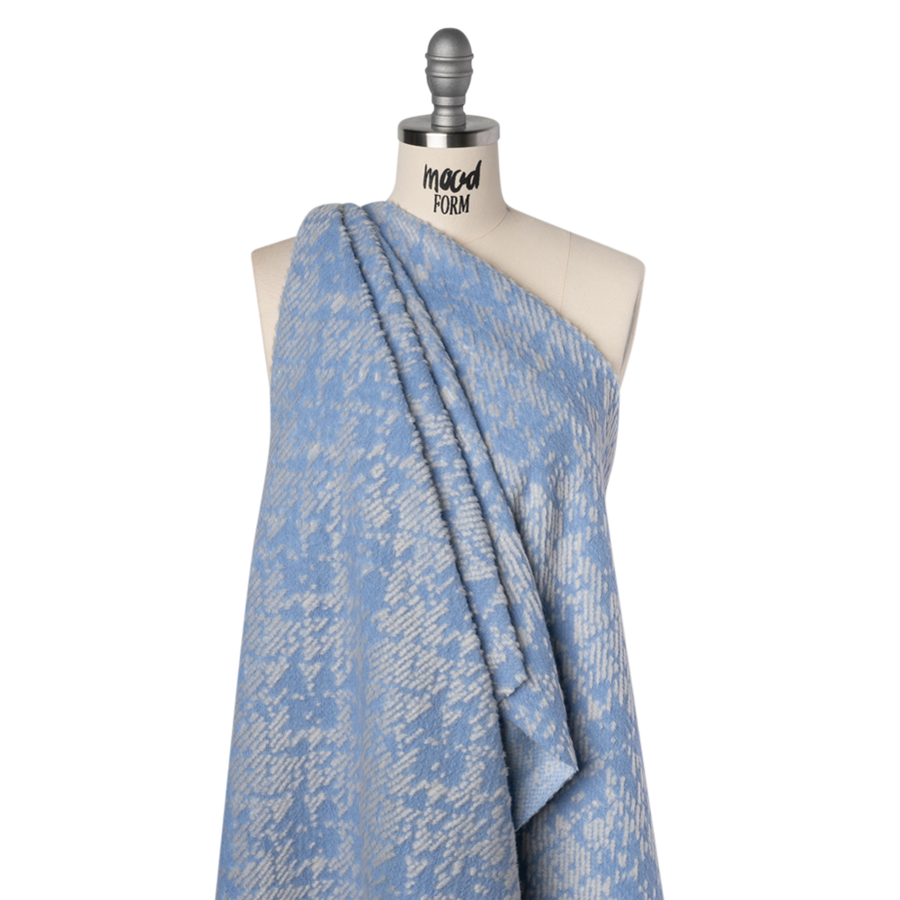 Brave the cool autumn air in this Sky Blue and White Geometric Super Short Pile Patterned Faux Fur—featuring a super soft hand and supple drape.Suggested Projects: Jackets, Coats, Vests, SkirtsContent: 70% Polyester, 30% ModacrylicStretch: Weftwise Mechanical GiveOpacity: Slightly TranslucentShort white tufts bloom in an abstract, geometric pattern against a sky-blue backdrop on this super-short pile faux fur. With a super soft hand and supple drape, it invites touch and tempts transformation into sweeping coats, cozy pencil skirts, belted jackets, and chic vests—each piece a cocoon of comfort and luxury. Slightly translucent, it needs no lining, though one may be added for an extra layer of warmth or polish.