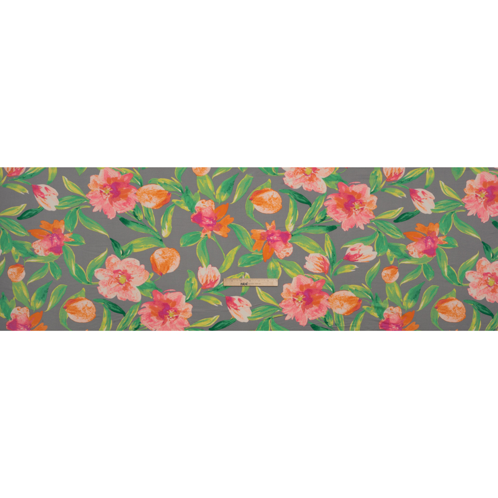 Super Soft Stretch Polyester Jersey - Neon Pink, Orange and Green Florals on Gray - Deadstock