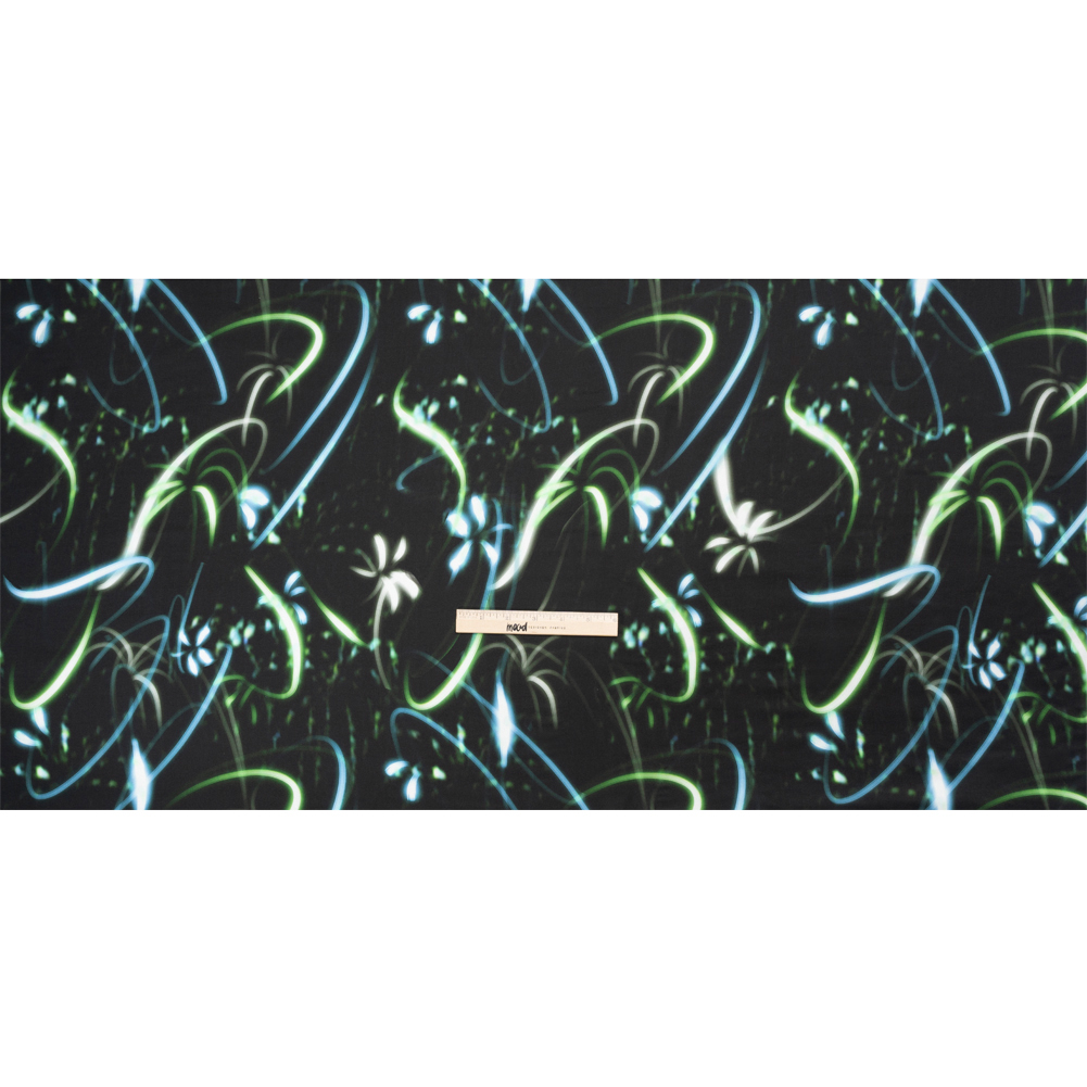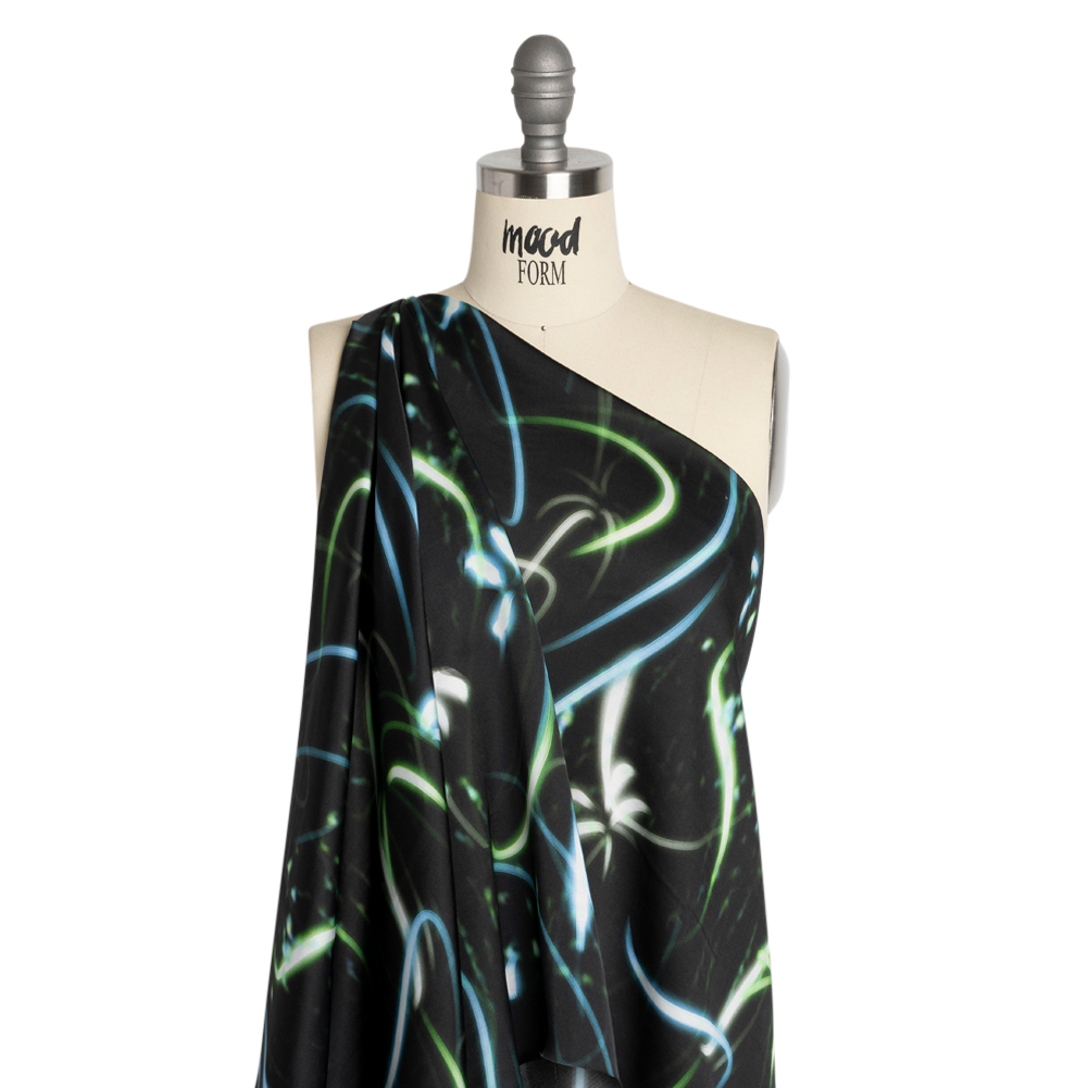 Enjoy seeing life through the lens of this Mood Exclusive Green Shutter Speed Racer Viscose and Recycled Polyester Satin! Like a camera capturing a fireworks display through a long exposure, trails of neon green, blue, and white lights bolt through a black sky. Viscose and polyester, both sustainably sourced, are blended in a satin weave to produce a sleek hand and a modest sheen. The lightweight and airy drape is delicate against the skin, playfully inviting the summer breeze to mingle with your garments. Ignite your wardrobe with vibrant button-ups, relax after a pool day in a luxurious pajama set, or head to barbeques with your hair tied back in a scarf!