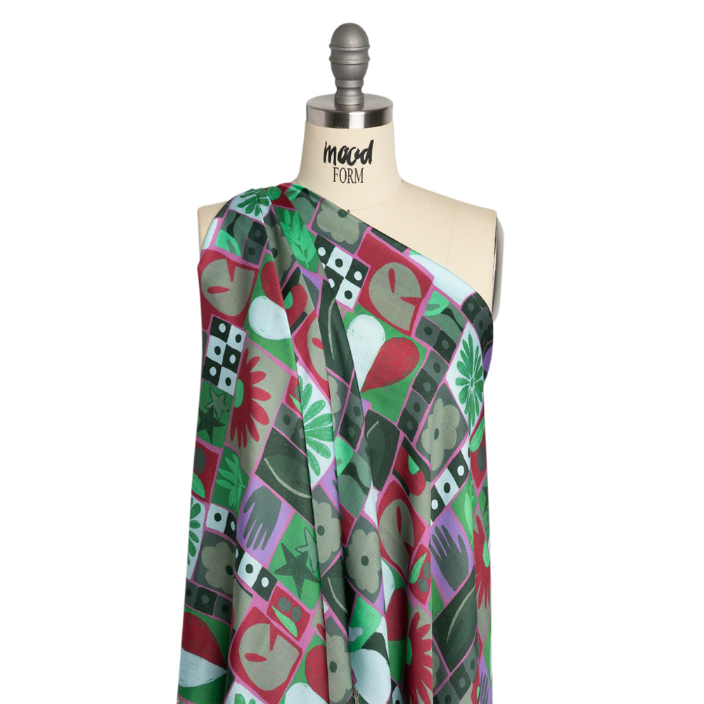 Sustainable and Recycled Viscose Satin Print - Green, Red and Gray Simple Symbols Patchwork - Mood Exclusive Come Together